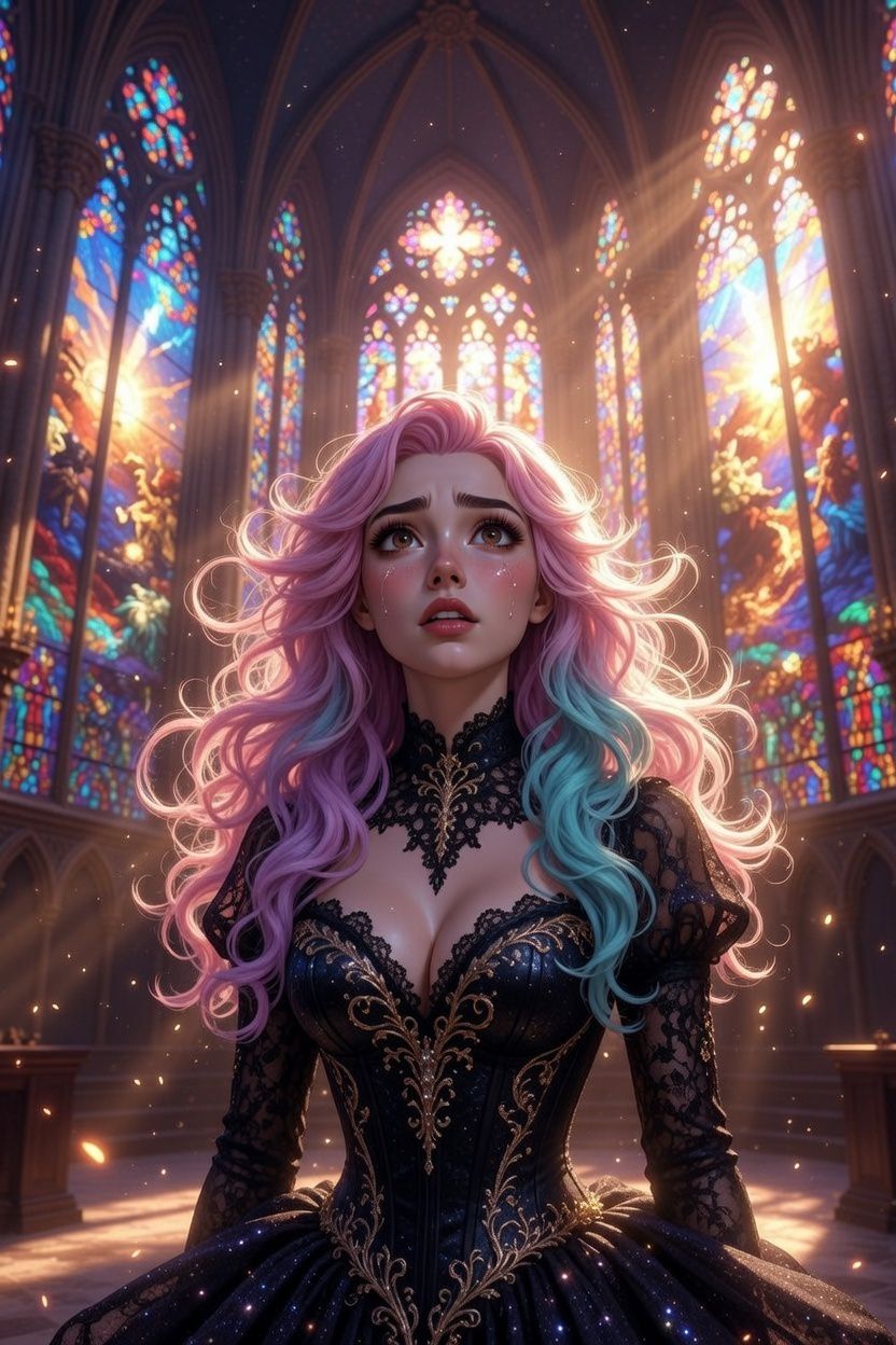 Epic operatic with high-floating female soprano lead meets rock ballad cinematic orchestral strings, deep colore bass, and dramatic cathedral reverb, Emotional storytelling about lost faith and dignity, with poetic lyrics centered on the line “Miracles are for everyone but not for me, ” Background choir echoes “miracles” after each chorus line, Structure includes three verses, a bridge, and a powerful final chorus, Sound design features breath crescendo before the last chorus and a distant soprano call in the outro, Style blends gothic elegance, rock ballad depth, and operetta grandeur, Tempo slow to moderate, rich harmonic layers, maximal duration 6 minutes, Background sacred choral choir