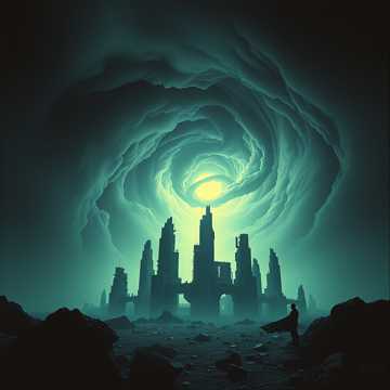 Progressive metal with polyrhythmic drums, tribal tom patterns, and dynamic cymbal swells, paired with detuned, crunchy guitar riffs and melodic, reverb-drenched leads, Feature syncopated, warm basslines and ambient synth pads for a cinematic, psychedelic atmosphere, Build from a tense, ambient intro to explosive choruses and a hypnotic instrumental bridge, Male vocals, haunting yet powerful, shift from soft croons to soaring belts, with poetic, metaphysical lyrics, Use a spacious, organic mix, tempo 90–110 BPM, "