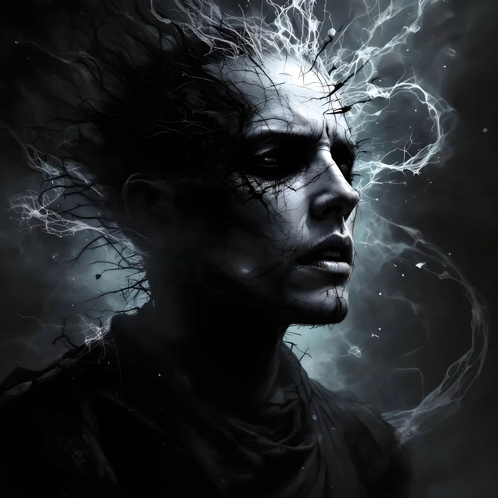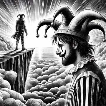 soulful, ballad, acoustic, pathos, indie folk, virtuoso guitar, spanish guitar, male voice, divine, ambient, fantasy, slow, eerie, cosmic horror, eldritch, emotional, madness, Jester, melancholic