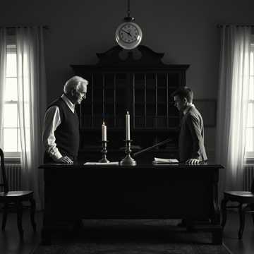 Dark cinematic dialogue song in German with two distinct, clearly different male voices, Voice 1 (Father): older male voice, deep, calm, weary, authoritative but fading and ruspy - Bass, Voice 2 (Son / Arthas): younger male voice, firm, controlled, emotionally restrained, determined - Hoher Bariton, Clear conversational structure with alternating lines, NO CHOIR, NO GROUP VOCALS, Slow to mid tempo, minimal instrumentation: low strings, soft piano, restrained percussion, Mood: tragic intimacy, inevitability, suppressed emotion, personal conflict, Focus on the feeling of a private confrontation between father and son, not a battle, High production quality, intimate and dramatic, no epic choirs