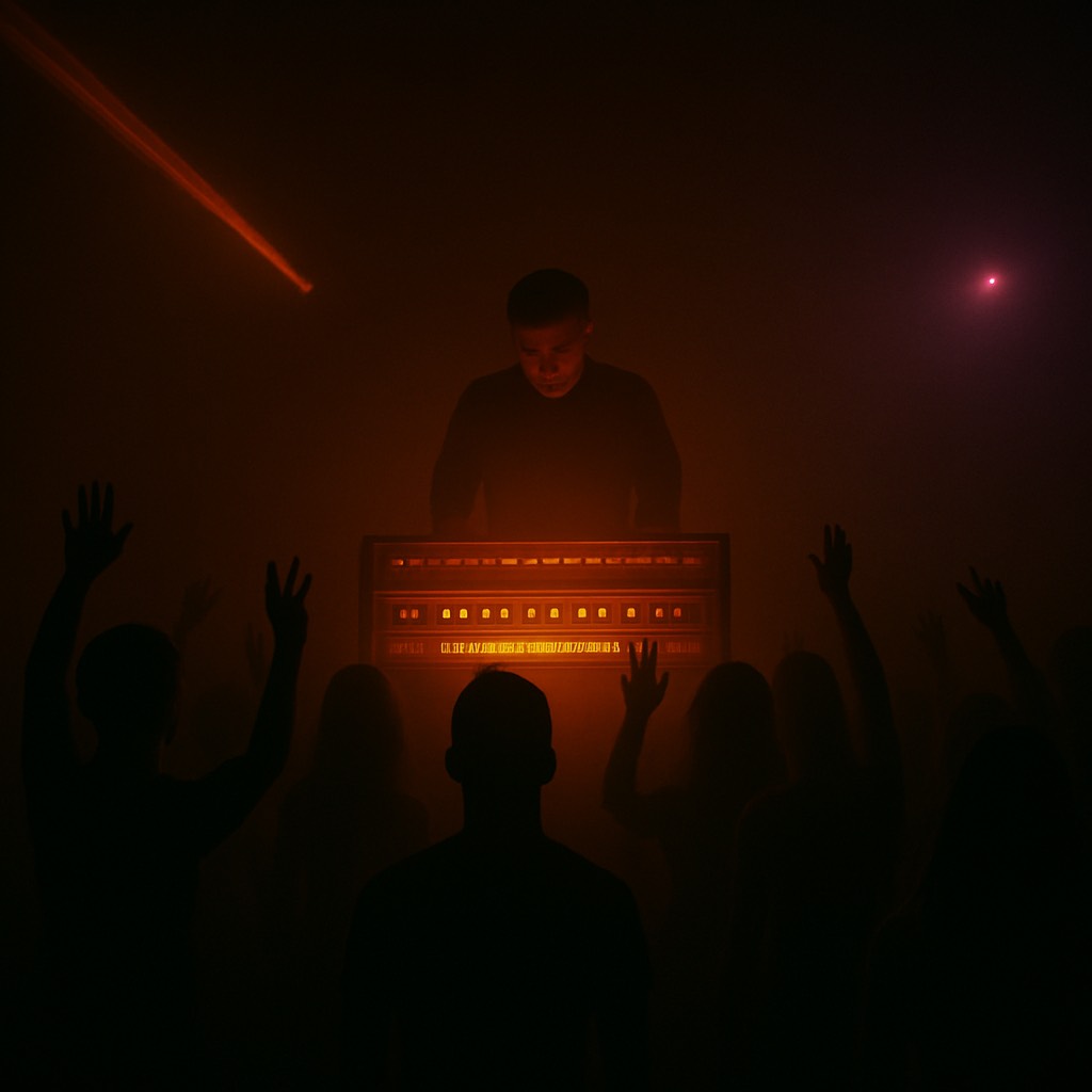 Futuristic hypnotic acid tech-house, ~6–7 minutes, 124 BPM, TR-909 mechanical kick, TB-303 acid bassline twisting and screaming, Juno-106 pads glitchy metallic haze, Robotic vocoder vocals, minimal and mantra-like, whispered ad-libs, Choruses manually doubled for repetition, Extended instrumental sections with glitch-like pads and mechanical groove, underground cyber-rave atmosphere