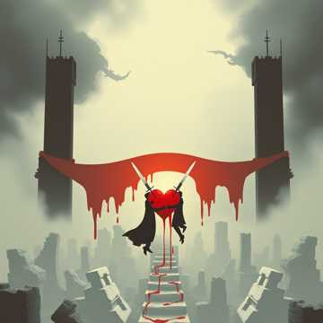 Cinematic hybrid score with choirs and war drums; sharp string ostinati drive the verses while low brass swells underneath, Male and female vocals in urgent call-and-response, then lock together in a soaring, tragic chorus with elven-style modal lines and close harmonies, Huge dynamics: verses tightly rhythmic and percussive; chorus opens into wide, echoing halls of reverb and layered choral stacks, Occasional distant horns and taiko-style rolls for weight; vocals stay upfront, raw, and emotional
