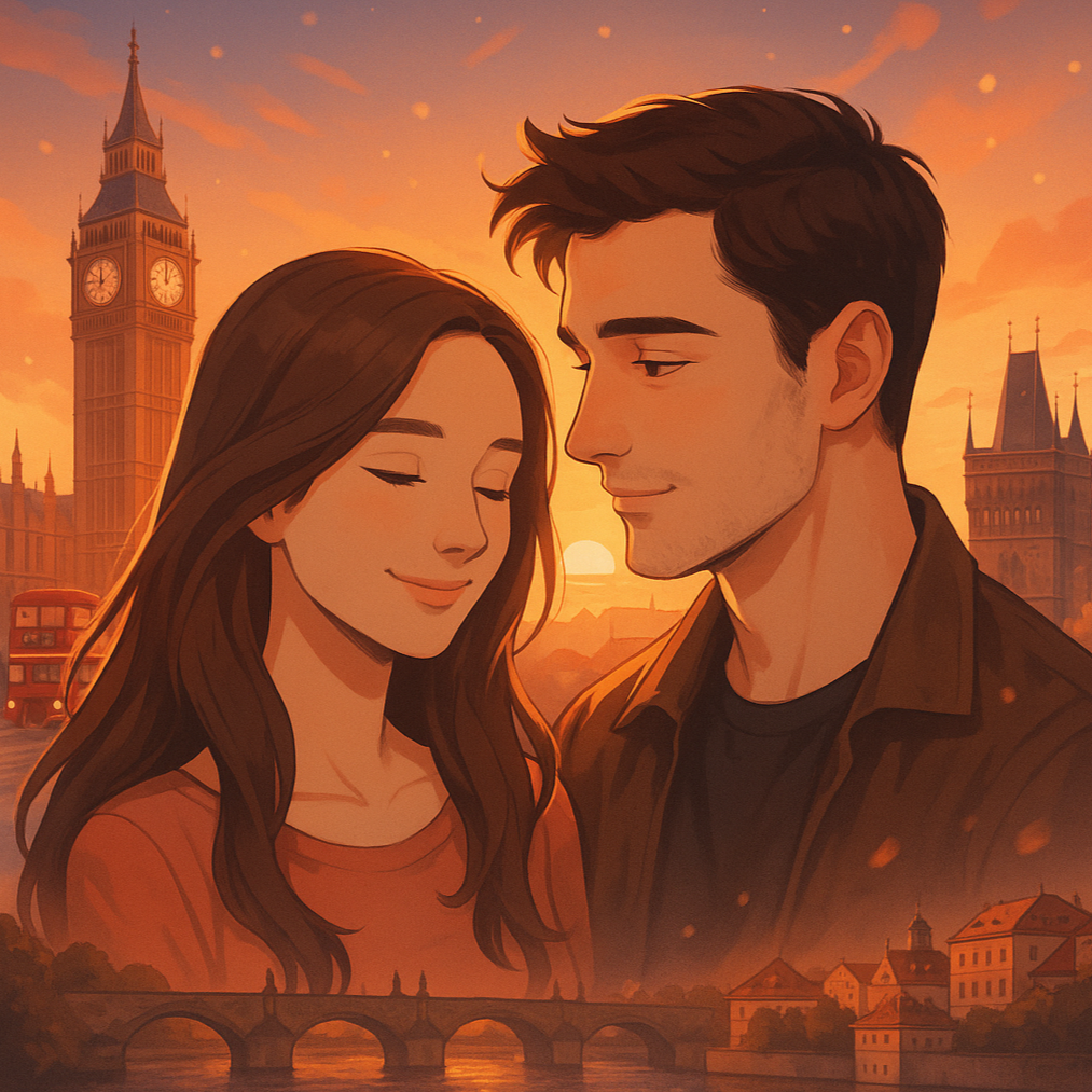 This is an emotional English pop song with a solo male lead vocal (25–35) and clear soft female backing vocals in the choruses (harmonies and echoes), The female voice should gently support the chorus with emotional depth, not as a duet, but as layered harmony, The song is called “London and Prague” – a bittersweet, romantic and hopeful story about a boy from Prague and a girl from London who met online, Every word they exchange brings them closer, and they dream of their first real meeting, The music feels intimate and cinematic, Instruments include soft piano, ambient textures, mellow guitar, subtle strings, and a modern light pop beat, Medium tempo (around 85 BPM), The mood is emotional, warm, and personal – like