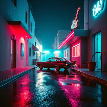A gritty, energetic 80s Pop-Rock / New Wave fusion track, channeling the "Scarface" soundtrack vibe, It blends Moroder-style signature sequenced electronic bass with live instrumentation, A distorted Electric Guitar plays power chords and palm-muted chugs that accent the electronic beat, The drums are heavy and punchy (LinnDrum style), The main hook is a sharp, aggressive Synth Lead riff that repeats infectiously, The atmosphere is edgy, nocturnal, and dangerous ("Miami 1980s"), It bridges the gap between dance music and rock, featuring intense energy and a driving tempo (around 140 BPM)