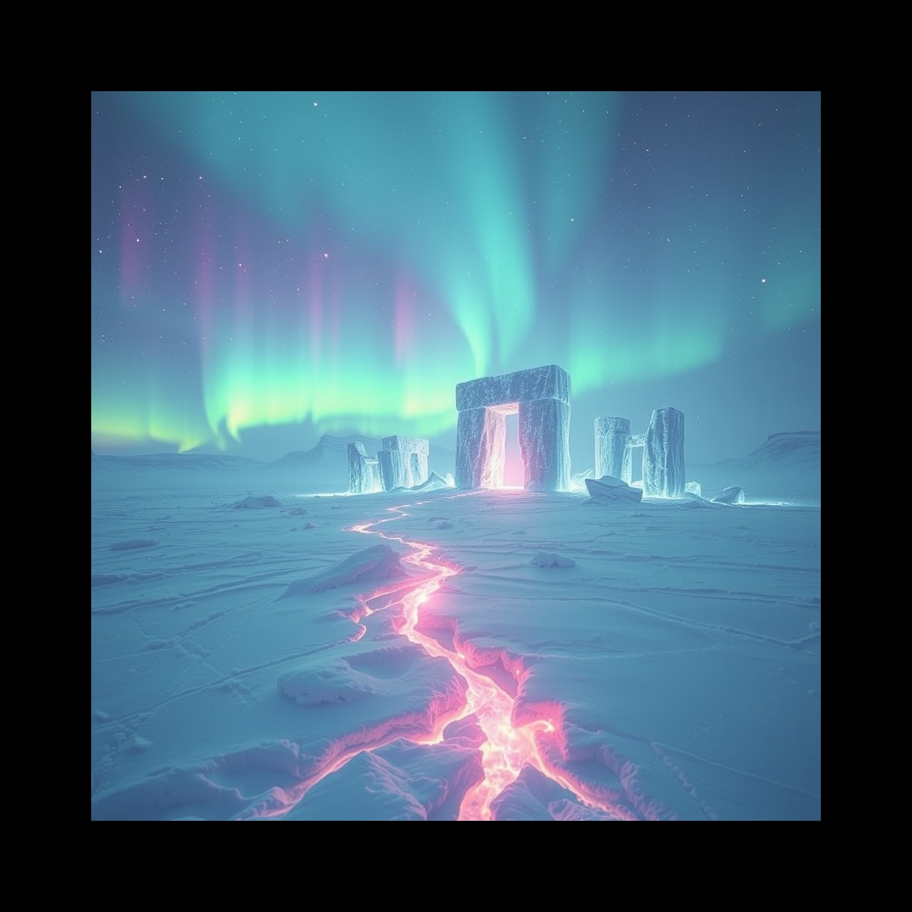 Arctic glitchwave, Experimental, Ethereal, Glacial, Shattered holograms shimmer over endless snow, ancient glyphs flickering in the polar dusk as digital auroras refract through frozen monoliths
