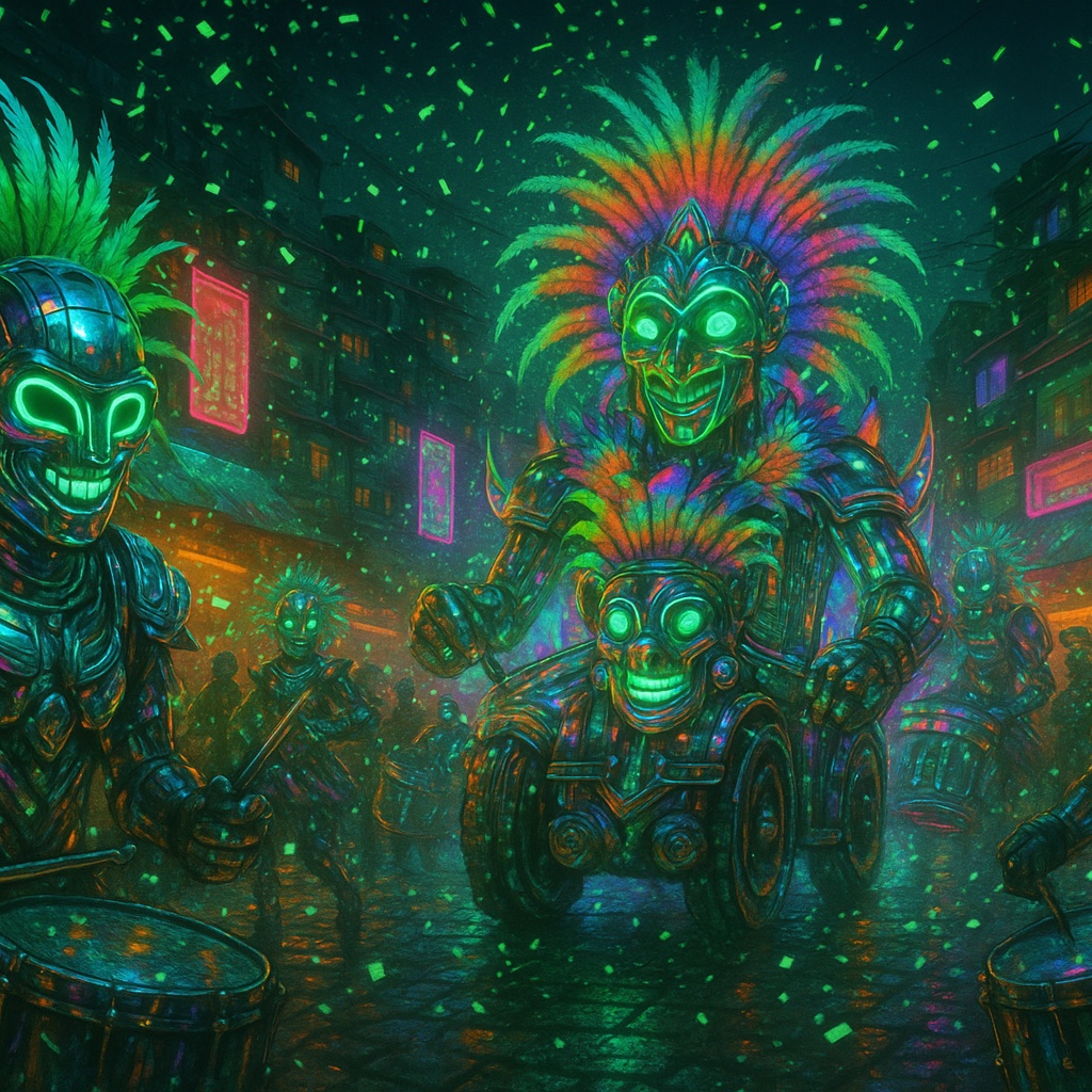 Neo-Tropical, Cyber-Carnival, Atypical, Bio-mech samba, resin drumline crackles, electric maracas, detuned brass loops swirl through vapor carnival haze glitching into thundering bass piston calliope