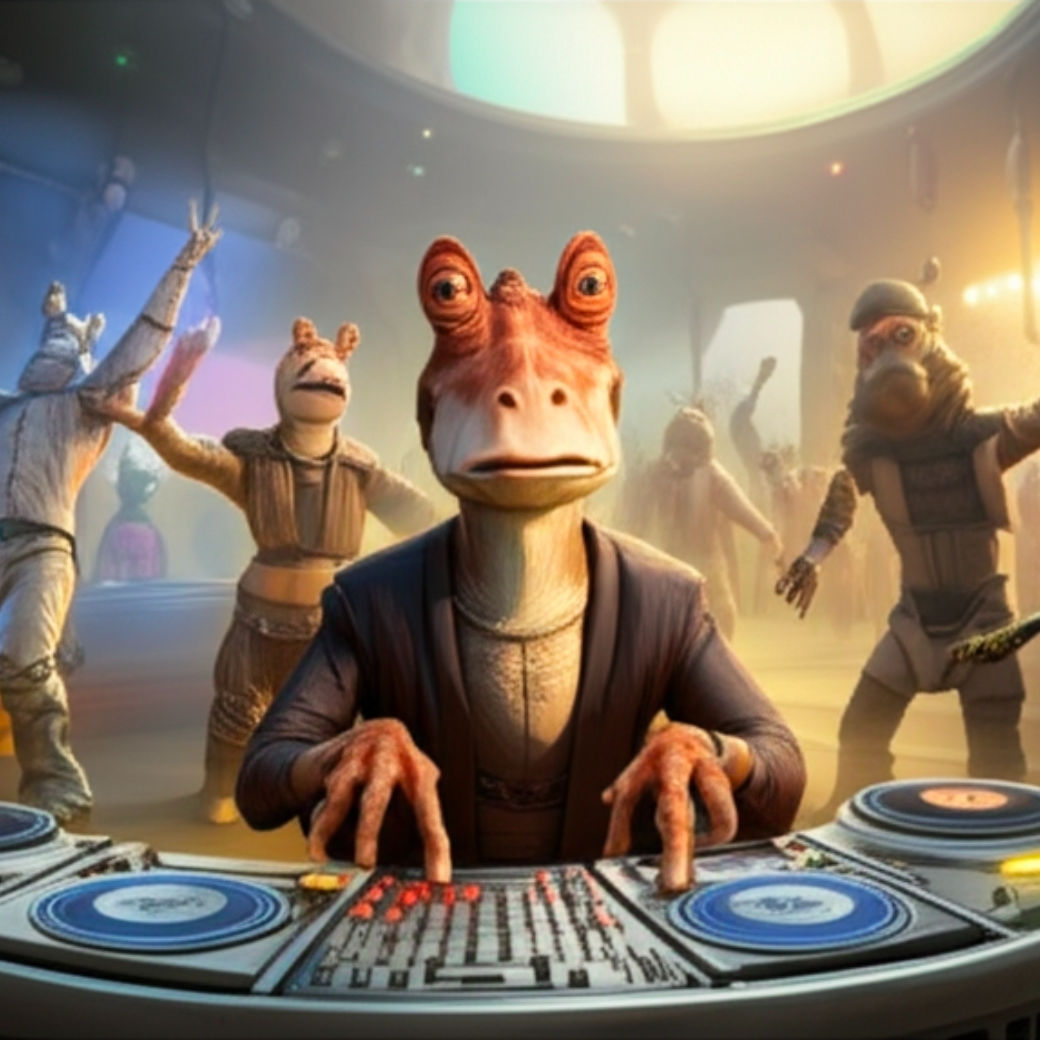 in the style of Jar-Jar Binks voice, Star Wars feel, goofy vocals, clumsy vocals, Jamaican youthful male vocals, club music, house party, upbeat, live beats, dance mix, dub