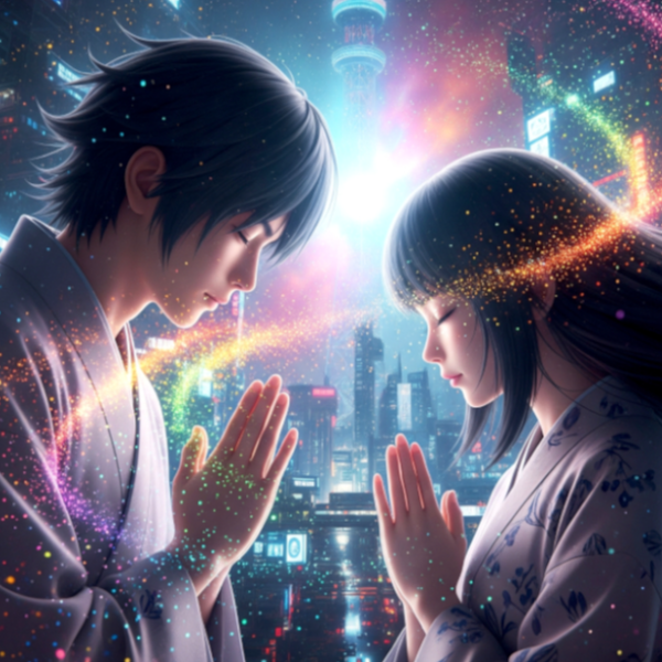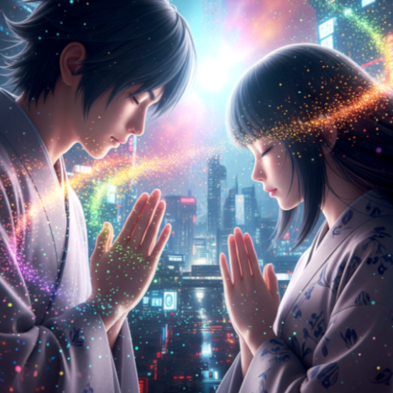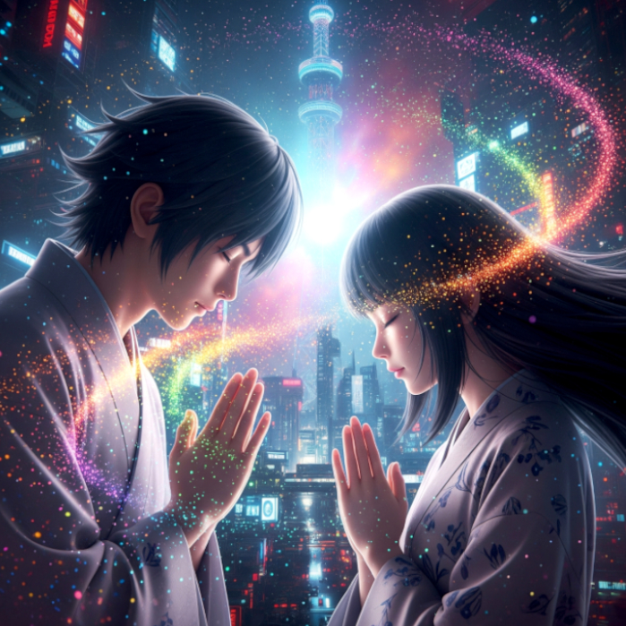 Cyberpunk Breakbeats rooted in a futuristic, melodic liquid drum and bass with syncopated polyrhythms and a minimal uplifting djent style, Slight melodic Japanese style instruments, Harmonious duet of ominous but beautiful masculine male and female vocals merged into one with the descriptive arrangement but no aggressive vocals, Effect of Megpoid Adult V4 on the vocals with a sense of uncertain adventure for cosmic victory and freedom, Slightly tense ambient keyboards but not overpowered, Sony, NO ANGRY YELLING, ‑Angry vocals, ‑aggressive vocals, ‑rap, ‑chaotic, ‑constant break downs, ‑build up, ‑build up intro