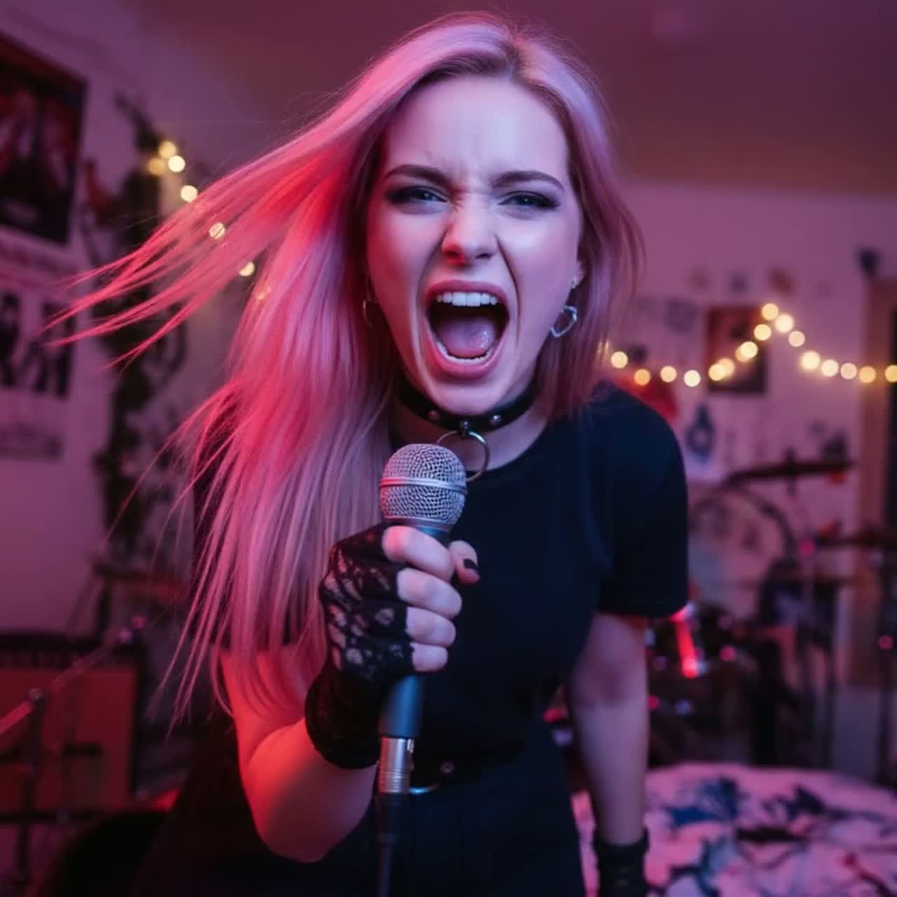alt-pop, emo trap, pop punk, grunge, punk, 140bpm, no mood-based tempo shift, Open with immediate full force, max volume, instant attack, First beat: crushing collision of distorted 808 kick, snapping snare, and a sudden, explosive vocal crack, [Intro] aggressive slap guitar rhythm, heavily distorted, instantly swelling dissonant detuned analog pad, no soft piano intro, [Drums] dominant distorted 808 sub-bass groove, heavy trap hi-hats, snapping clap rhythm, unstable glitch fills, [Bass] deep sub-bass, heavy and warm, sidechain with kick, [Guitar] sharp slap rhythms, tremolo walls, overdrive punch in chorus, dreamy washed layers in bridge and final, [Piano] cinematic, hard attack, imperfect and slightly detuned in bridge and break, [FX] reversed delays, detuned pads, whisper echoes, tape hiss, vinyl crackle, breath left in, short moments of silence, [Female lead vocals] very hard raspy, husky, breathy, strong vibrato, raw, trembling, frantic, whisper-to-explosive, voice must crack
