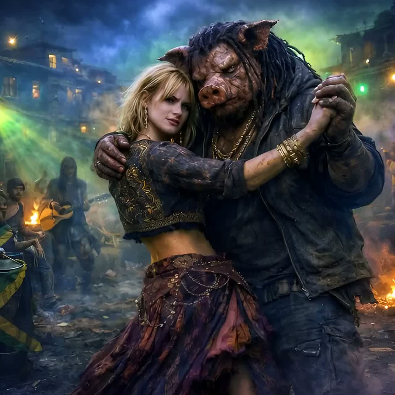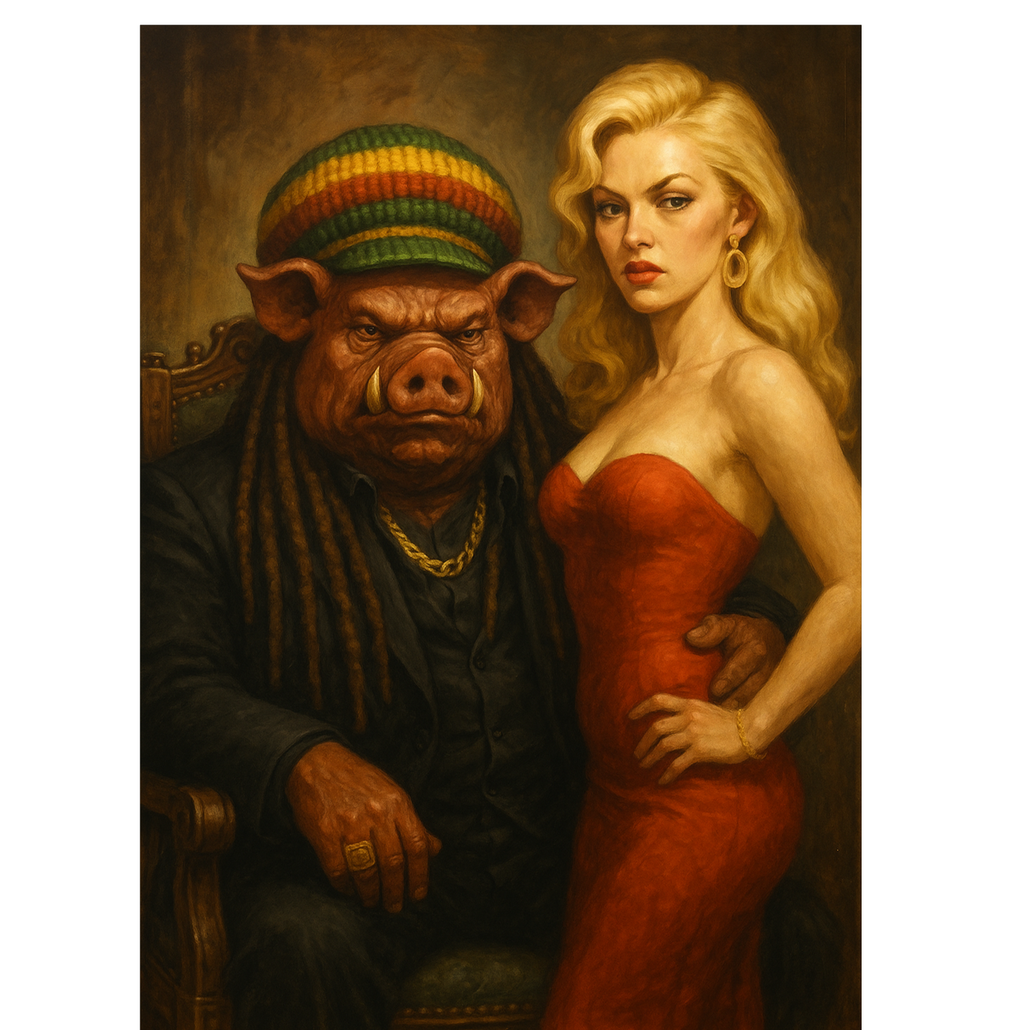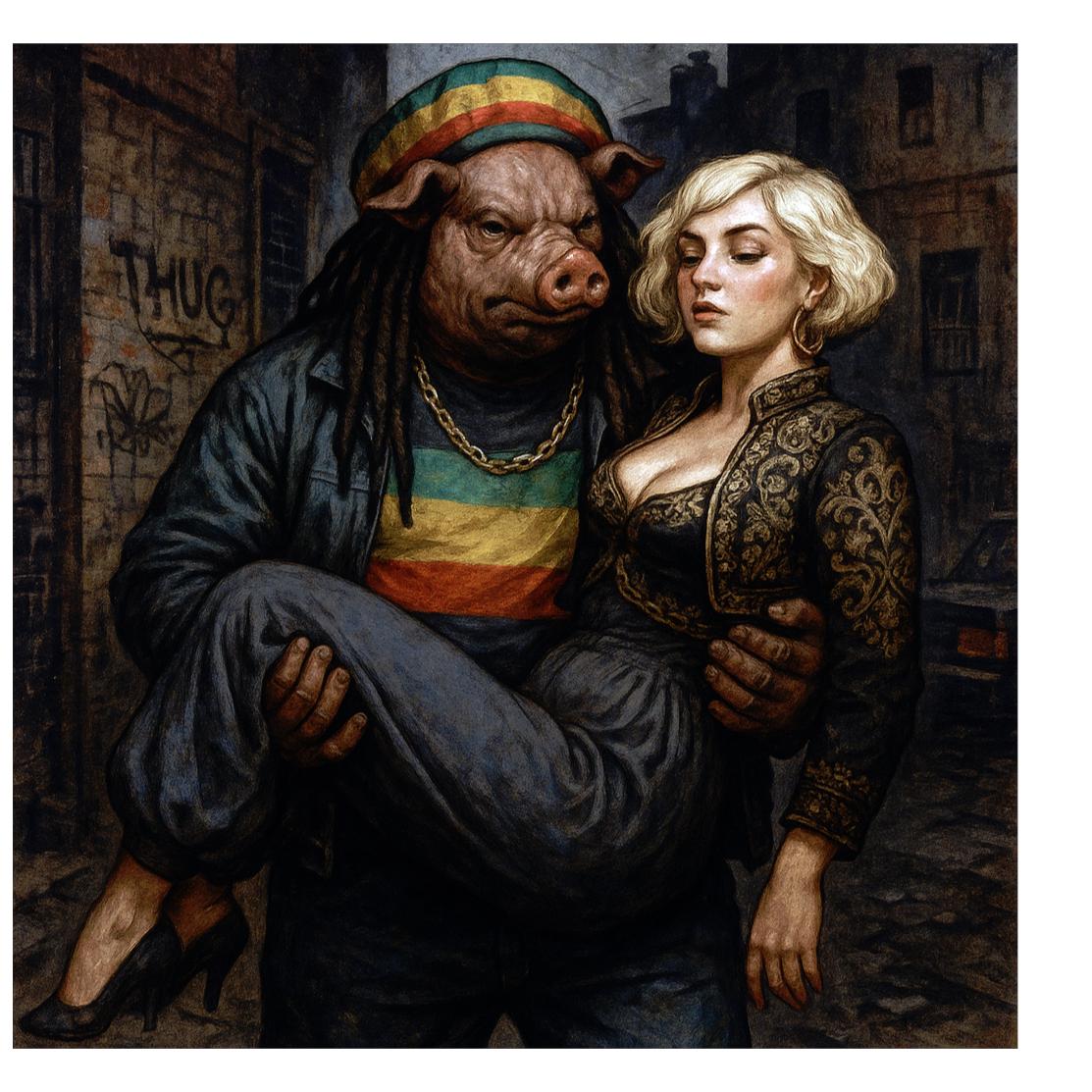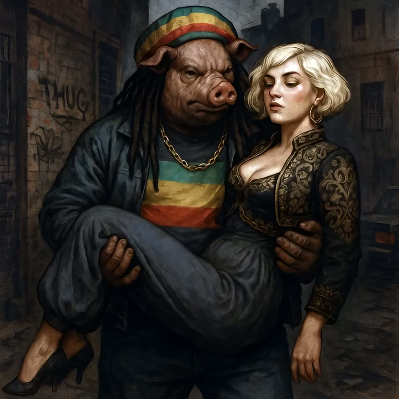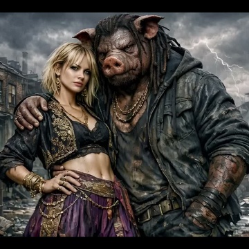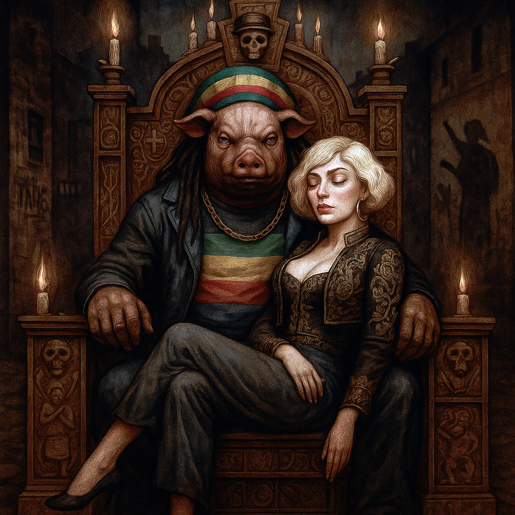 Deep, traditional reggae song with a dark, soul-moving atmosphere, Influences from Lee “Scratch” Perry, Eric “Monty” Morris, and the best known of them all Bob, Heavy one-drop rhythm, deep bassline, offbeat guitar chops, echo and reverb, dub textures, Male vocal raw and heavy, female vocal cool and detached, weaving in and out, Lyrics tell of a brutal, larger-than-life drug kingpin — an anthropomorphic Pig Man — and his German lover, a broad with a blonde shaggy mid-length bob, Tone is menacing, mythic, and soulful, Title: “Pig Man & the Broad