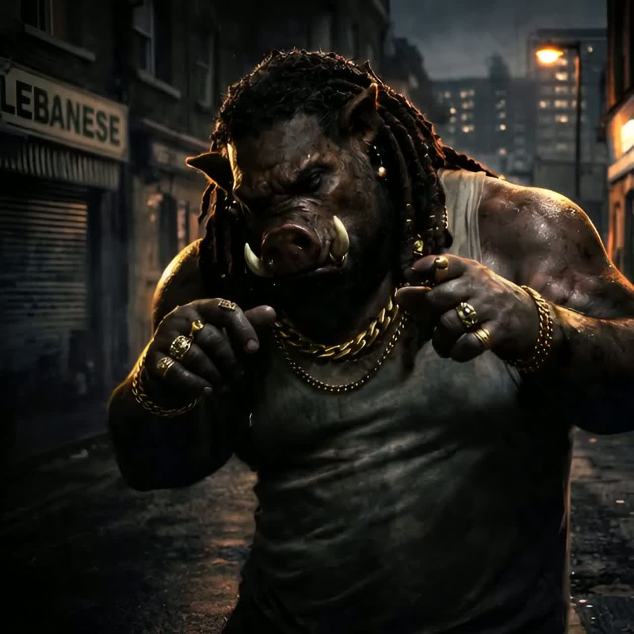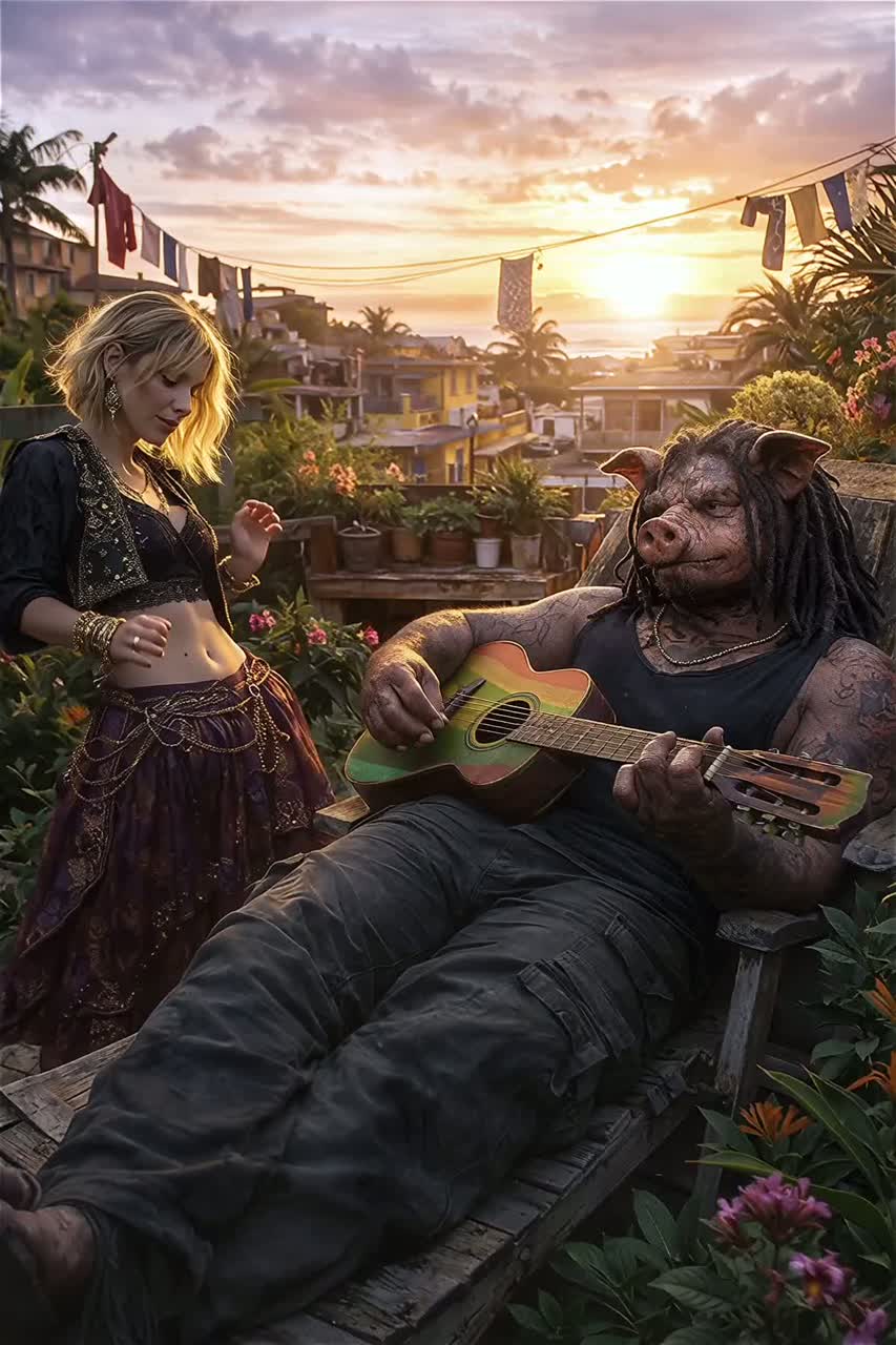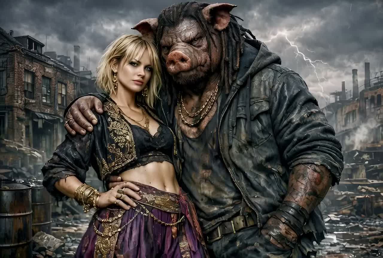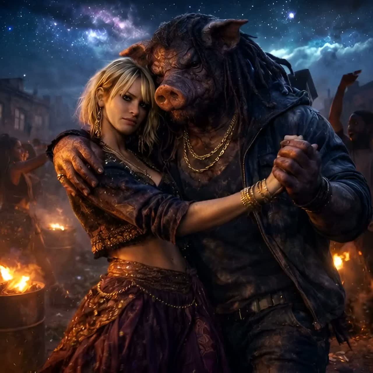 Deep, traditional reggae song with a dark, soul-moving atmosphere, Influences from Lee “Scratch” Perry, Eric “Monty” Morris, and the best known of them all Bob, Heavy one-drop rhythm, deep bassline, offbeat guitar chops, echo and reverb, dub textures, Male vocal raw and heavy, female vocal cool and detached, weaving in and out, Lyrics tell of a brutal, larger-than-life drug kingpin — an anthropomorphic Pig Man — and his German lover, a broad with a blonde shaggy mid-length bob, Tone is menacing, mythic, and soulful, Title: “Pig Man & the Broad