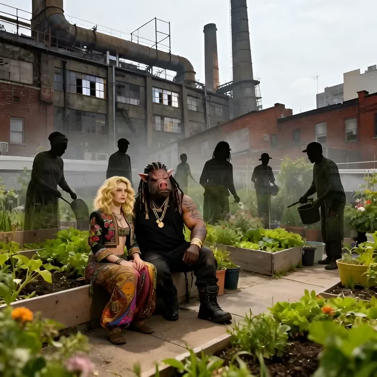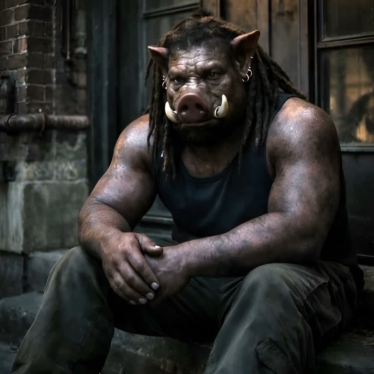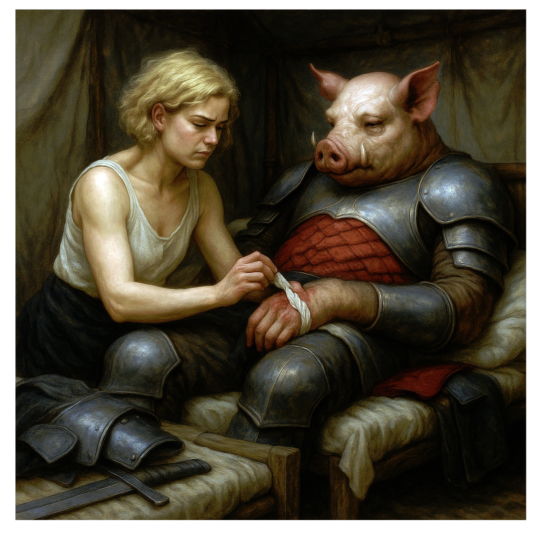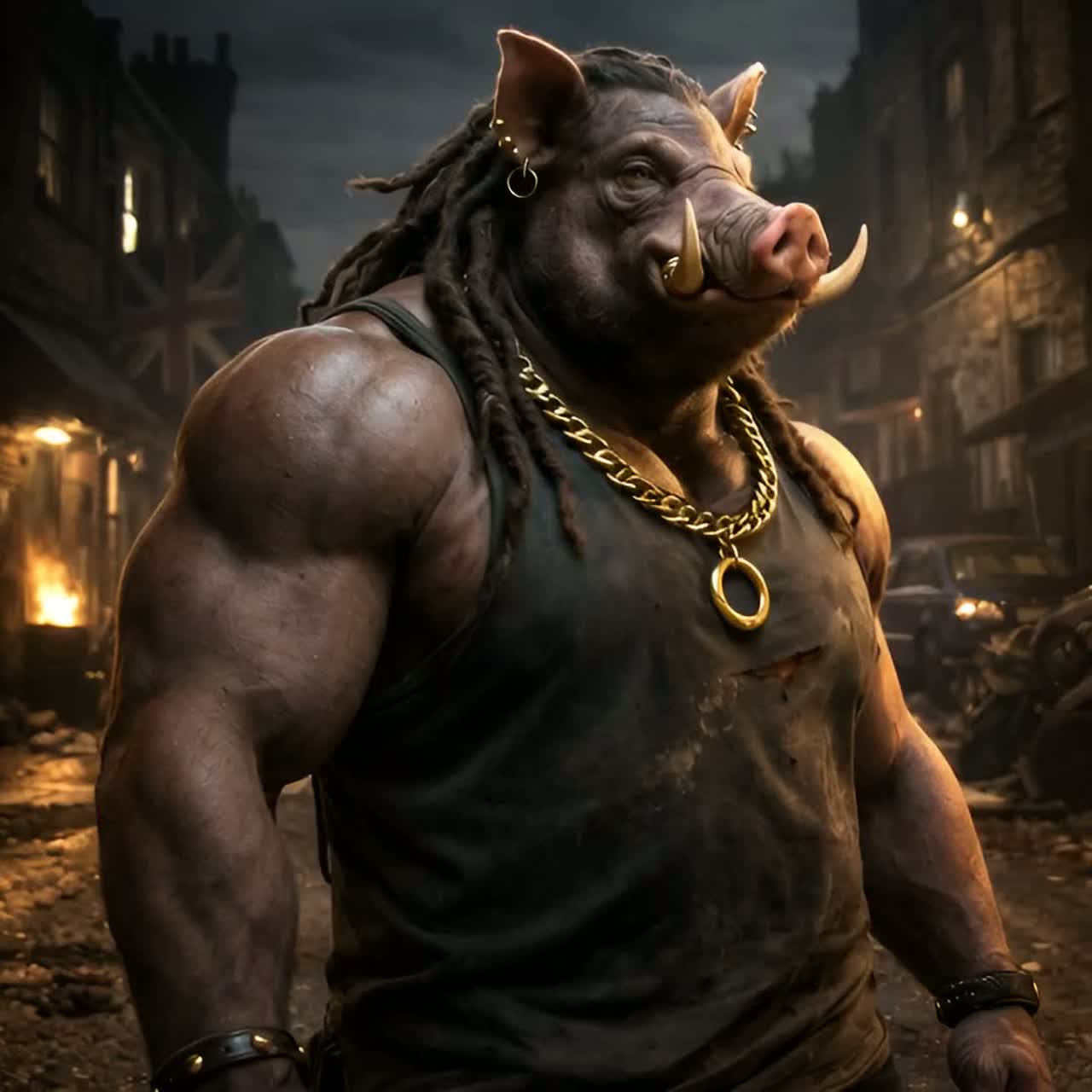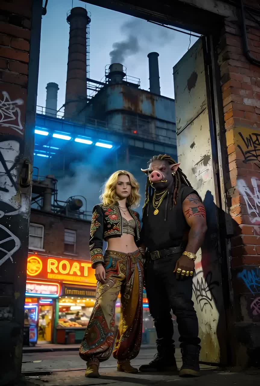 Deep, traditional reggae song with a dark, soul-moving atmosphere, Influences from Lee “Scratch” Perry, Eric “Monty” Morris, and the best known of them all Bob, Heavy one-drop rhythm, deep bassline, offbeat guitar chops, echo and reverb, dub textures, Male vocal raw and heavy, female vocal cool and detached, weaving in and out, Lyrics tell of a brutal, larger-than-life drug kingpin — an anthropomorphic Pig Man — and his German lover, a broad with a blonde shaggy mid-length bob, Tone is menacing, mythic, and soulful, Title: “Pig Man & the Broad