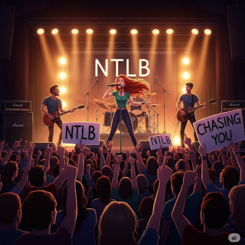Male lead vocals: Smooth, emotive delivery hybrid) — soft and haunting in verses, soaring and desperate in the bridge, with a chant‑like cadence in the chorus (“En‑tee‑el‑bee”), Ad‑libs & harmonies: Echoing falsettos, reverb‑heavy whispers (“say it… say it… N‑T‑L‑B”), and layered rock harmonies in the bridge for a gritty, alternative texture, Chorus: Anthemic, chantable hook: “En‑tee‑el‑bee… No time left broken…” with crowd‑style backing vocals for live energy, Synths: Dark 80s synthwave pads and plucks, slowly building into brighter arpeggios for the chorus, Guitars: Clean, ambient guitar riffs in the verses style), Low, distorted sub‑bass hums, A single ambient guitar pluck repeats, Whispered ad‑libs swirl in reverb, )