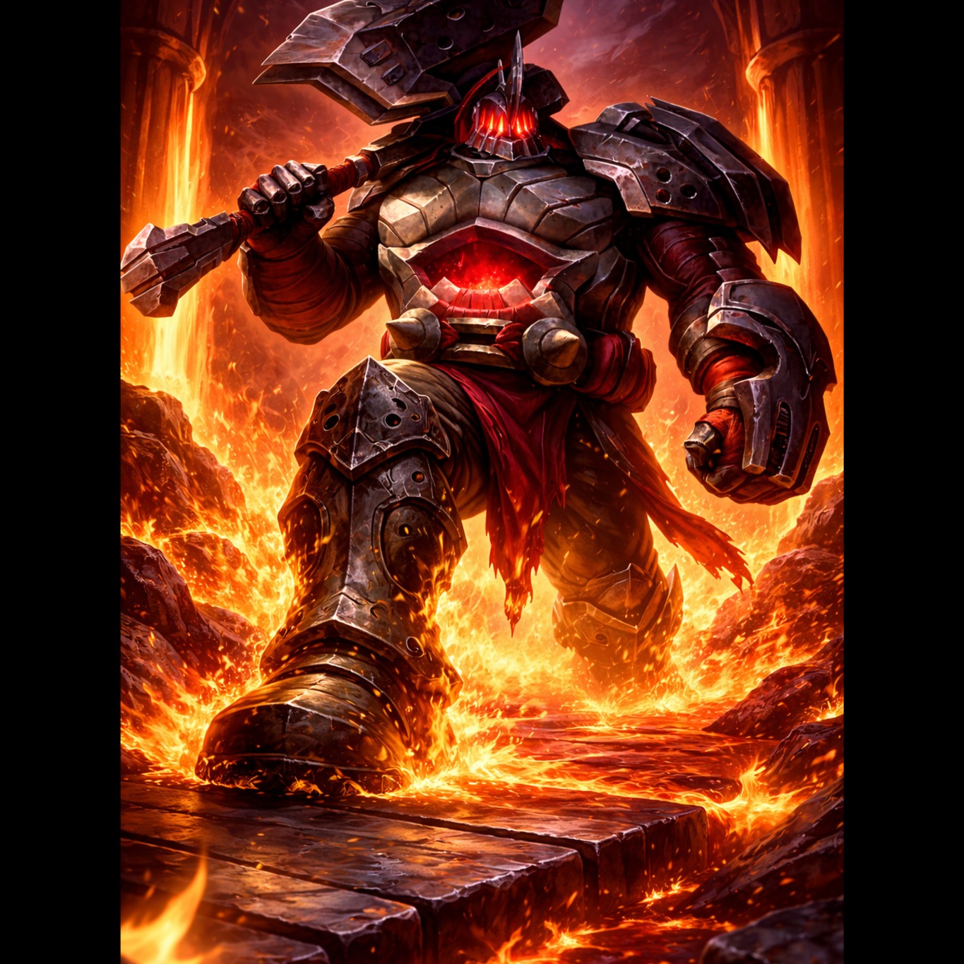 Relentless downtuned guitars lock with punishing industrial percussion and metallic hits, underpinned by pounding war drums and menacing synth drones, Verses march with slow, crushing precision, erupting into explosive, militaristic choruses, A brutal breakdown ignites a charging, apocalyptic finale, with the ultra-deep, warrior-like vocals—rolling R’s and cavernous resonance—commanding the battlefield with unstoppable, undead energy