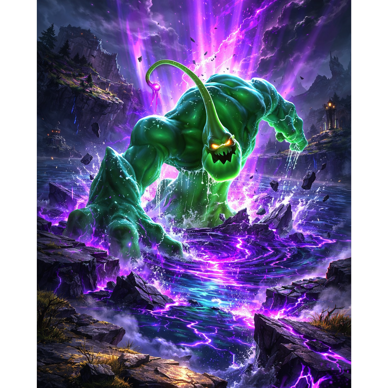 Vocals: deep, echoing monstrous male voice, friendly but powerful, slight reverb as if speaking from sewer tunnels