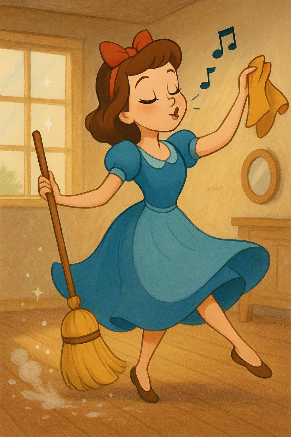 Upbeat Danish Disney-style work song with cheerful female vocals, Light orchestration with whimsical strings, playful percussion, and a magical retro feel, Inspired by “Whistle While You Work” with a modern twist, Female vocal, danish