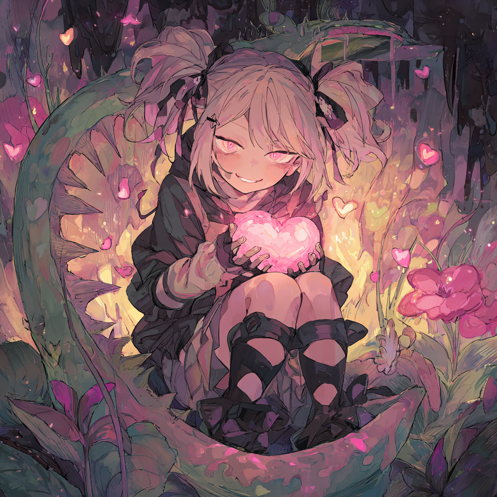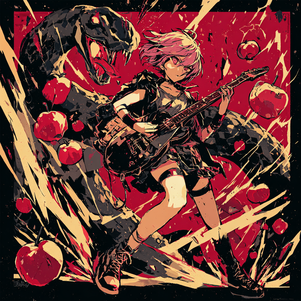Features: Starts directly with a catchy chorus hook (“ハート ハート アイ あい 愛”), meme-able repetitive phrases like “ルア ルア ルア / ガァプ ガァプ ガァプ, ” verses driven by guitar rhythm, pre-chorus with ironic dark humor, bridge featuring hypnotic looped vocal phrases with subtle guitar noise swells, final chorus exploding with layered guitars and synths, outro fading with distorted guitar riff echo