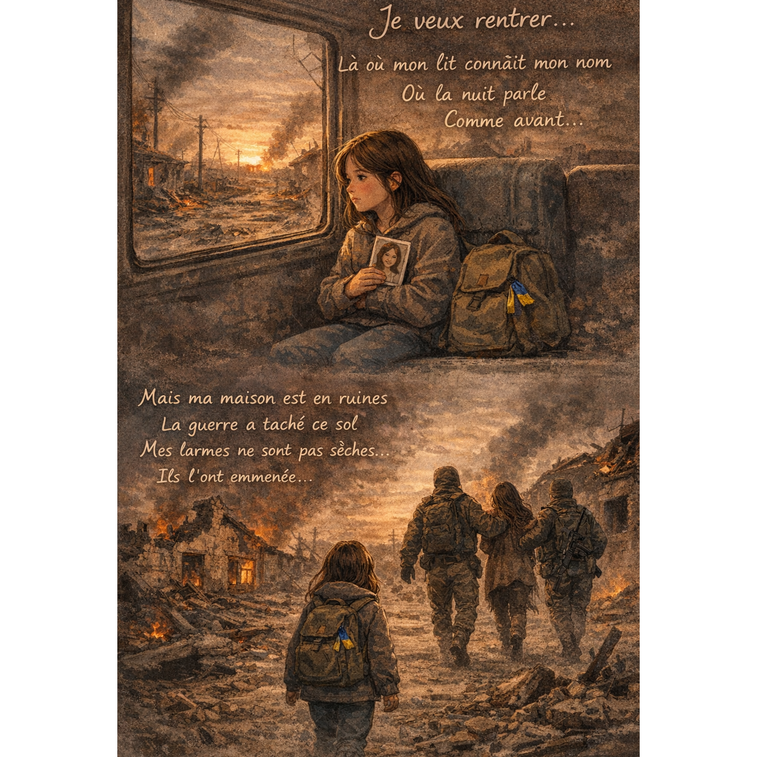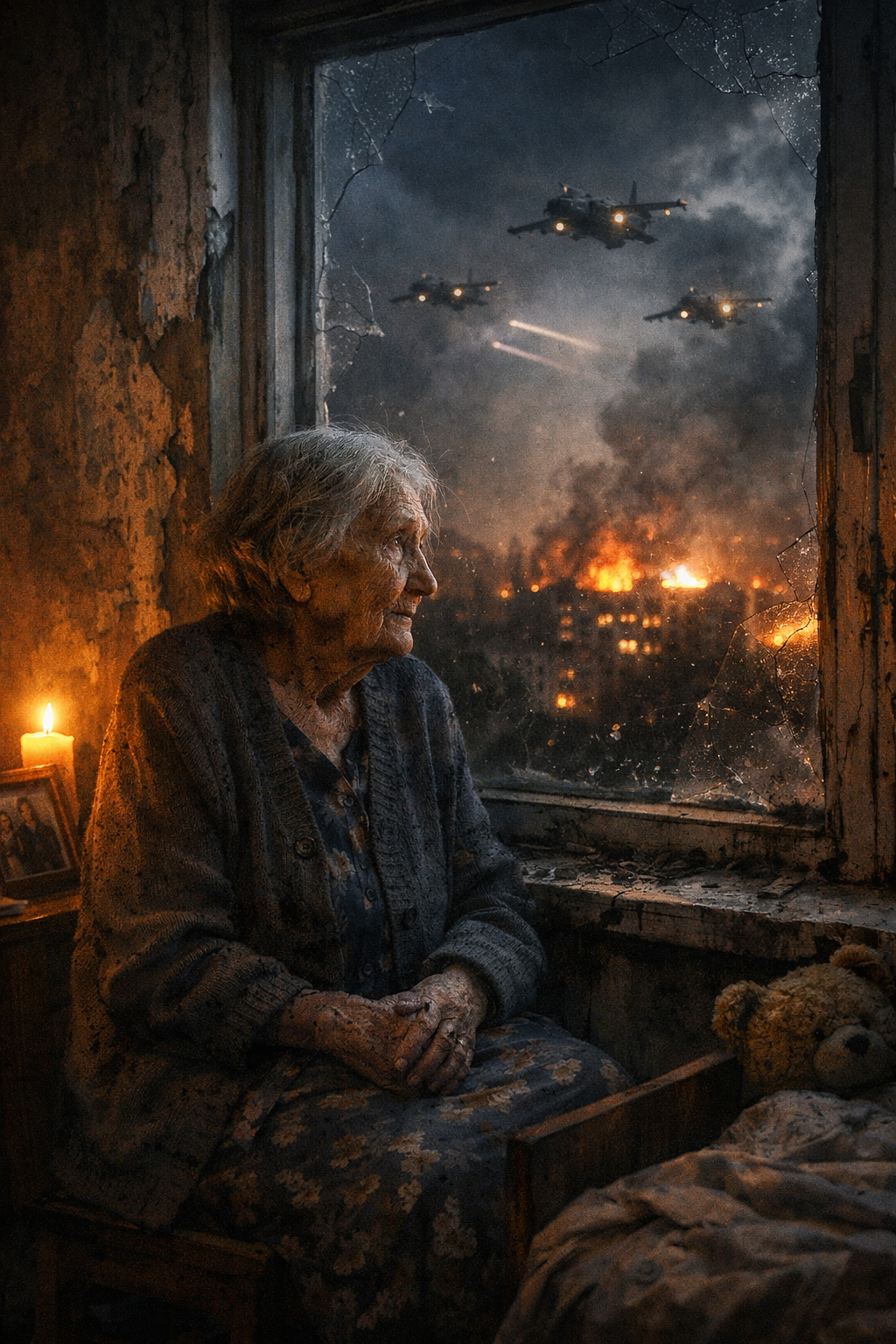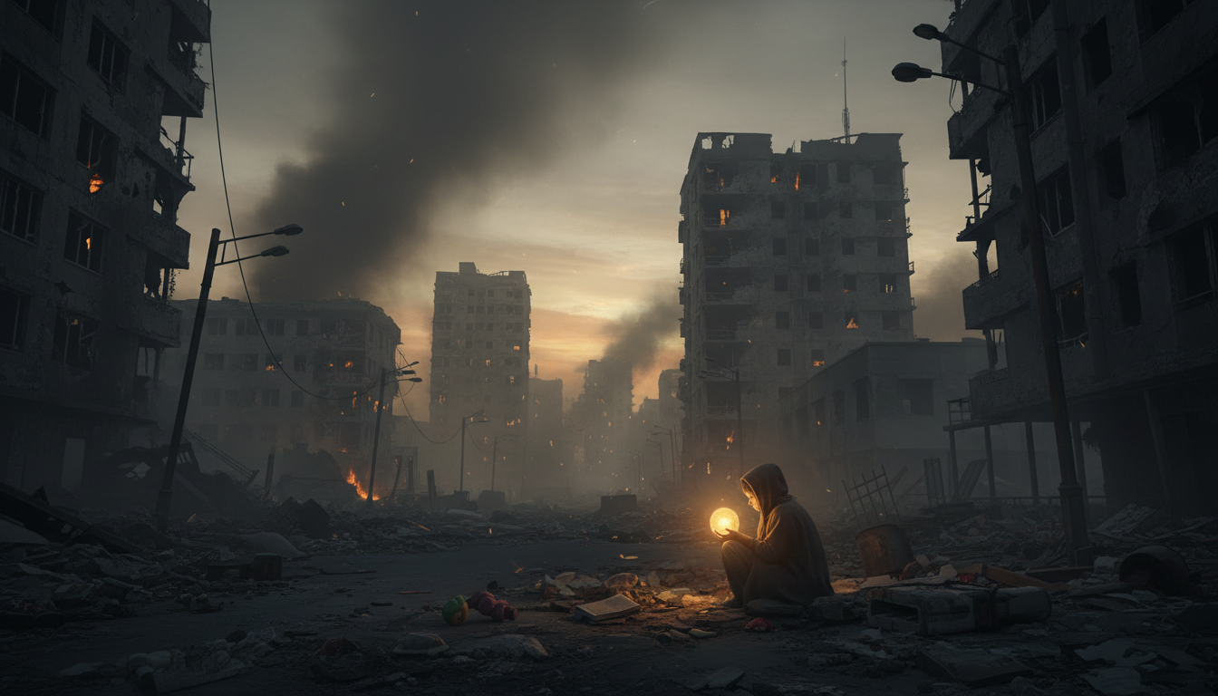 Write a heartfelt, piano-driven song with light strings and warm acoustic guitar, The tone should be emotional, intimate, nostalgic, and cinematic, Preserve a gentle rhythm and flowing imagery, Use the following text as the emotional core and transform it into a cohesive song with verses, pre-chorus, chorus, bridge, and outro, Keep the language poetic, soft, and vivid, The song should reflect warm childhood memories, peaceful daily moments, the sudden arrival of war, the loss of home, and the inner light that survives despite destruction