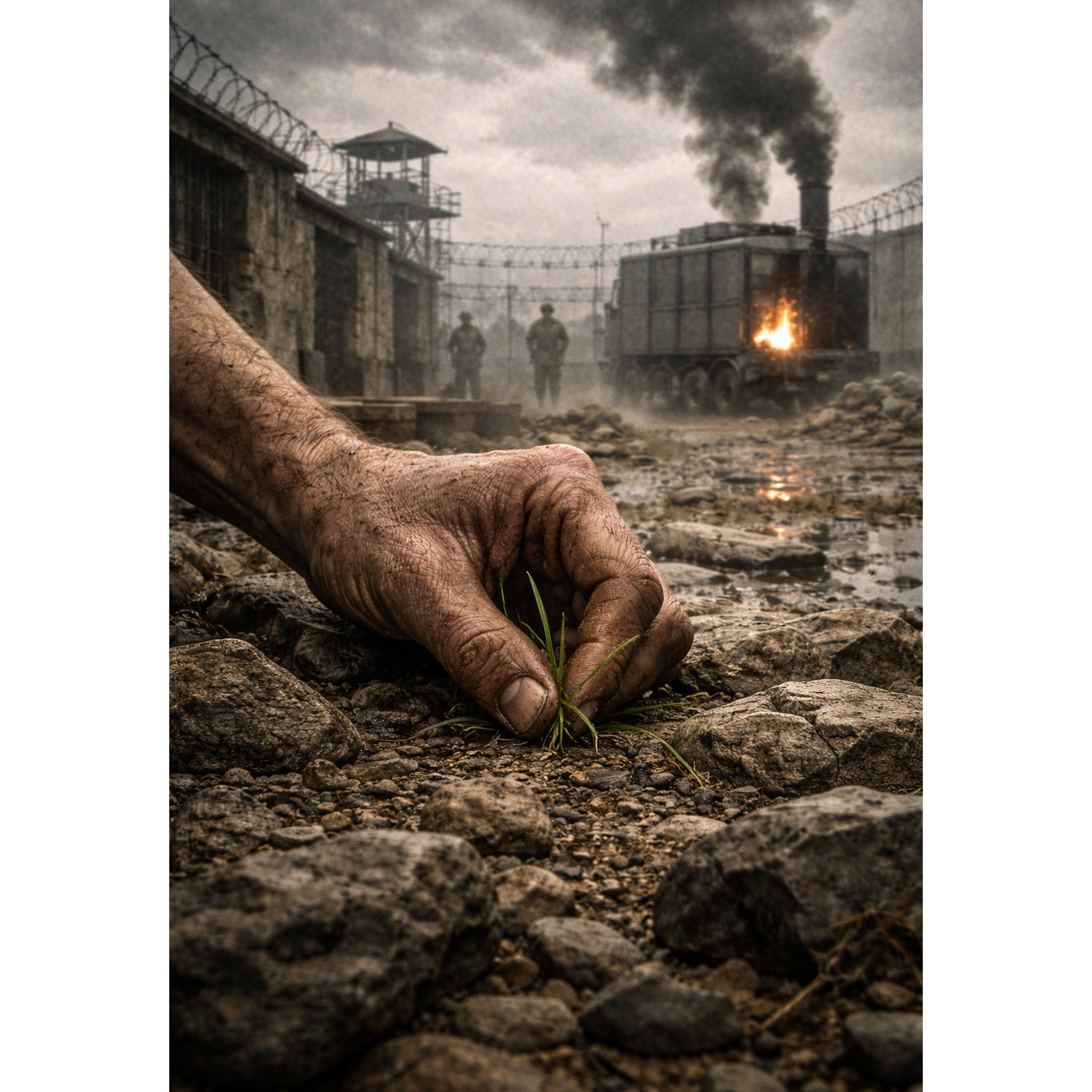 Ukrainian ethno-trance / post-folk minimalism; deep pulsating bass, hypnotic electronic drones, slow marching percussion, subtle folk flute or sopilka echoes, distant male chanting, layered choral harmonies, ambient textures like wind and battlefield echoes, Vocals — raw, emotional, with repetitions, mantra-like delivery, raspy male timbre carrying grief and resilience, Mood — haunting, ceremonial, spiritual, like a prayer in the steppe