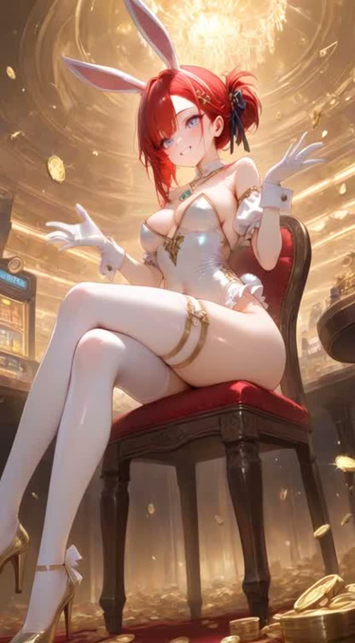 [Style: Nu-Disco / Electro Funk / 116BPM / Key: D minor / Female vocal, powerful and glamorous tone / bright brass section, slap bass, funky guitar, shimmering disco strings, lively handclaps, 4-on-the-floor beat / crowd cheering and coin drop SE / playful and luxurious casino bar atmosphere / strong groove with gold-shining energy / chorus layered vocals and chant "Go! Go! Bunny!" / use of champagne popping FX in intro and outro / bridge with dreamy echo and rising FX / outro features sax solo, gentle coin/glass FX fade-out / overall vibe: rich, fun, sparkling, confident, like a jackpot celebration]