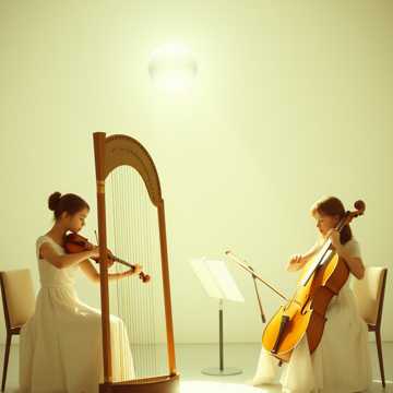 Classical chamber music string quartet, with a harp and one soprano, An arty aria, building in intensity as the melody moves from instrument to instrument, The original audio also is mixed in