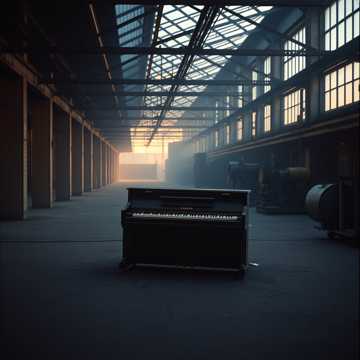 Dark ambient, Industrial drone, Minimalist piano, 65 BPM, Haunting, Melancholic, Distorted low-end, Cinematic textures, Lo-fi vinyl crackle, Spacious reverb, Cold metallic pads