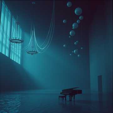 This ambient orchestral piece opens with waterphone textures and thermen for an unsettling intro, Haunting piano motifs echo in a vast hall reverb, woven with ethereal strings drifting in and out, Dark, pulsing beats underpin the atmosphere, gradually intensifying the ominous tension
