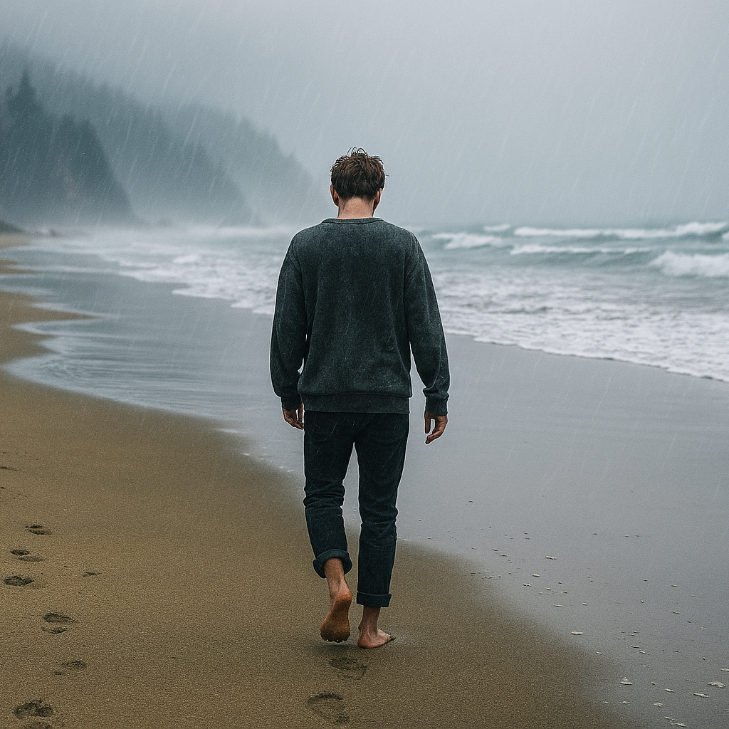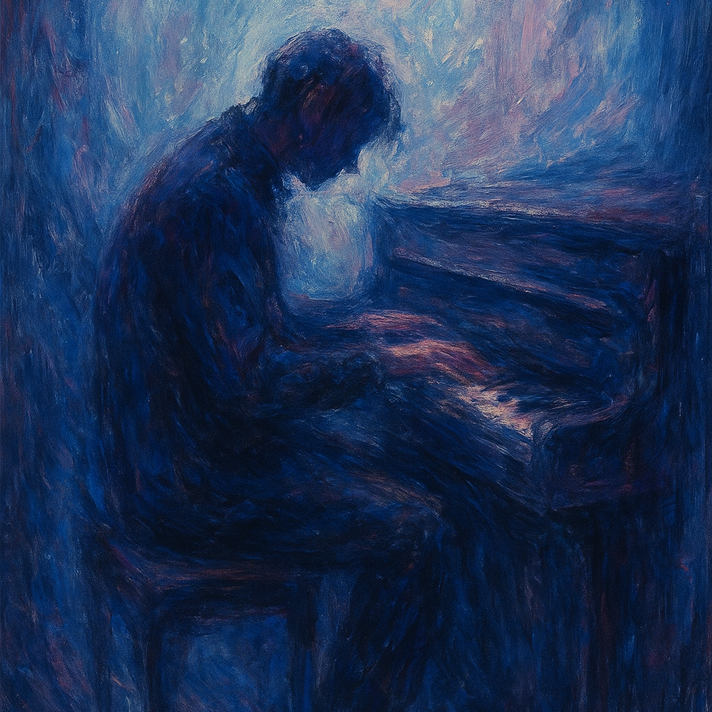 Delicate indie textures with moody, introspective piano at the heart, accompanied by soft fingerpicked guitar and gentle ambient sounds of rain, Subtle brushed drums and distant synth pads deepen the melancholy vibe, while sparse bass grounds the reflective, atmospheric arrangement