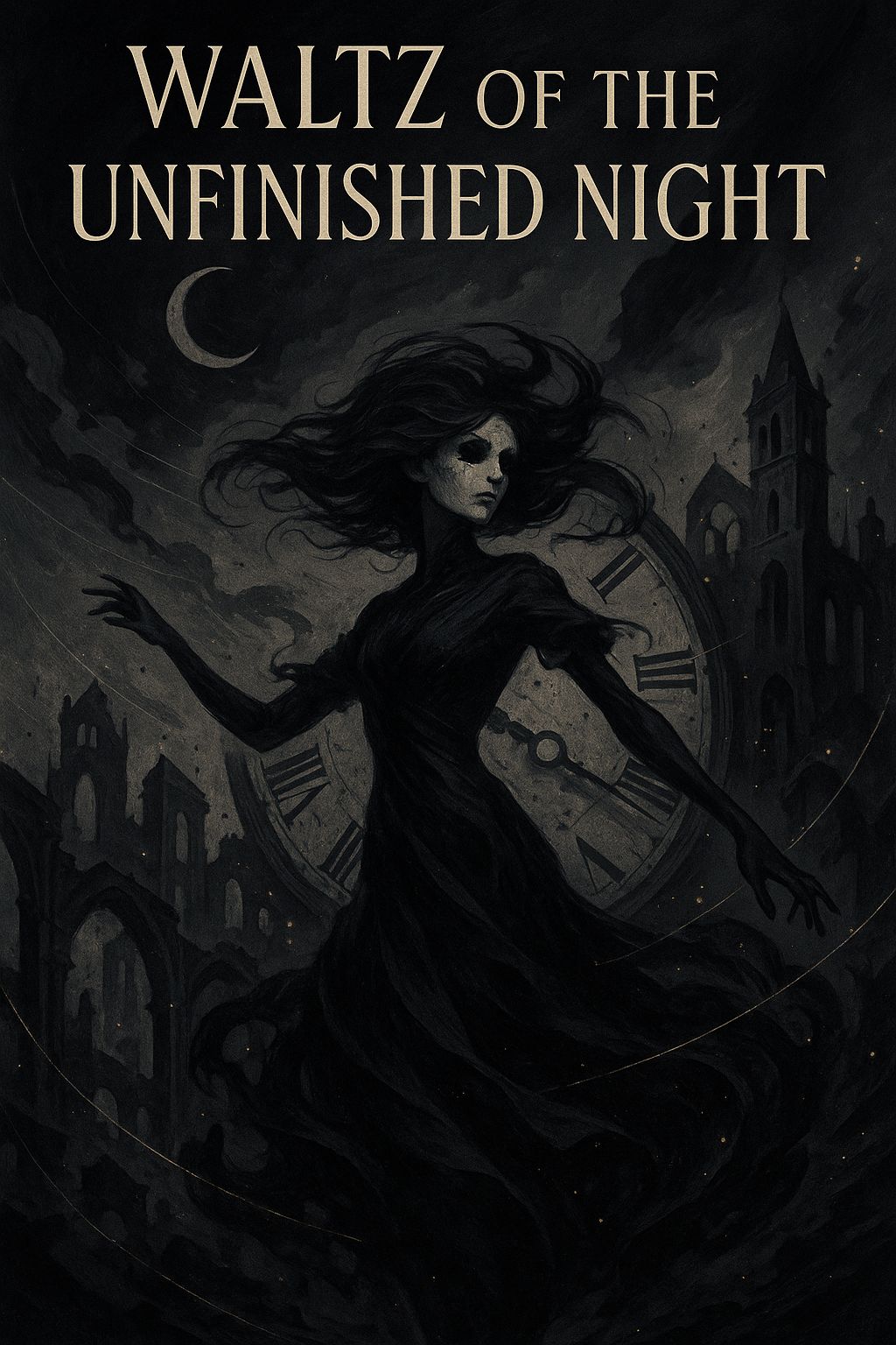 apocalyptic dark orchestral waltz with gothic choir, dissonant strings, church organ, music box and clockwork percussion, fast 3/4 time, dramatic and chaotic, soundtrack for a surreal witch carnival final boss battle