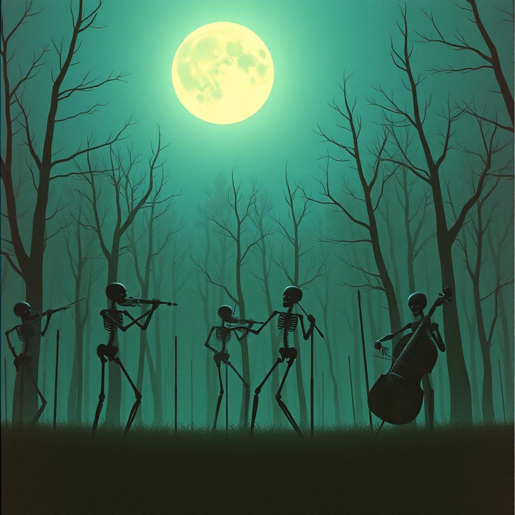 Deeply haunting yet catchy orchestral 90s indie rock with a raw, melancholy, slanted feel, Angular, slightly dissonant acoustic guitars with jangly strumming and sudden bursts of chaotic energy, absolutely no electric instruments, all instruments must be acoustic, Loose but driving rhythm section—busy orchestra double bass played with a bow and punchy, imperfect drums that feel played live, not locked to a grid, Male low baritone vocals delivered half-sung, half-shouted with dry, detached doleful attitude and bursts of melancholic urgency, group backing vocals like a church congregation, Moderate-to-fast tempo (120–140 BPM), Abrupt dynamic shifts between restrained verses and explosive orchestral choruses, Production is mid-fi and gritty—natural room sound, minimal effects, no gloss, College-rock energy, noisy but super catchy, tense and scrappy, No pop polish, no synths, no metal, add cello, violin, viol, timpani drum, bassoon, bass clarinet, flutes, xylophone and grand piano