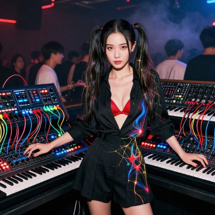 Instrumental melodic techno, Chinese electronic live performance vibe, 128 BPM, hypnotic groove in F# minor, Deep punchy kick, rolling sequenced bass with strong sidechain, metallic minimal percussion, modular west coast pluck lead with ping-pong delay (signature 4-bar hook), evolving analog pads and neon atmosphere, tape hiss and glitch effects, long build-up, live modulation jam section with random gate variations, breakdown without kick, powerful final drop, modern club mix, wide stereo, no vocals, more modular improvisation, more filter movement, less repetition Suno-Prompt (200 Zeichen – klare Instrumente)