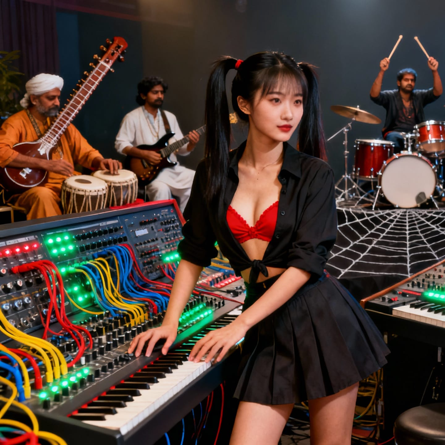 A mixture of classical ragas, gentle sitar melodies and tabla rhythms with strong beats Metalelectronic live performance vibe, 130 BPM, key D minor, Strong club groove with deep punchy kick and rolling sequenced bass with heavy sidechain, Metallic minimal percussion, modular west coast pluck lead sequence, hypnotic evolving filter movements, Add powerful synth fanfares (brass-like horn synth stabs) as a signature hook, cinematic and energetic but still techno, Breakdown with reverb fanfares, then a big final drop, Modern club mix, wide stereo, analog warmth, no vocals, more live modular randomness, more filter automation, stutter effects Suno-Prompt (200 Zeichen – klare Instrumente)
