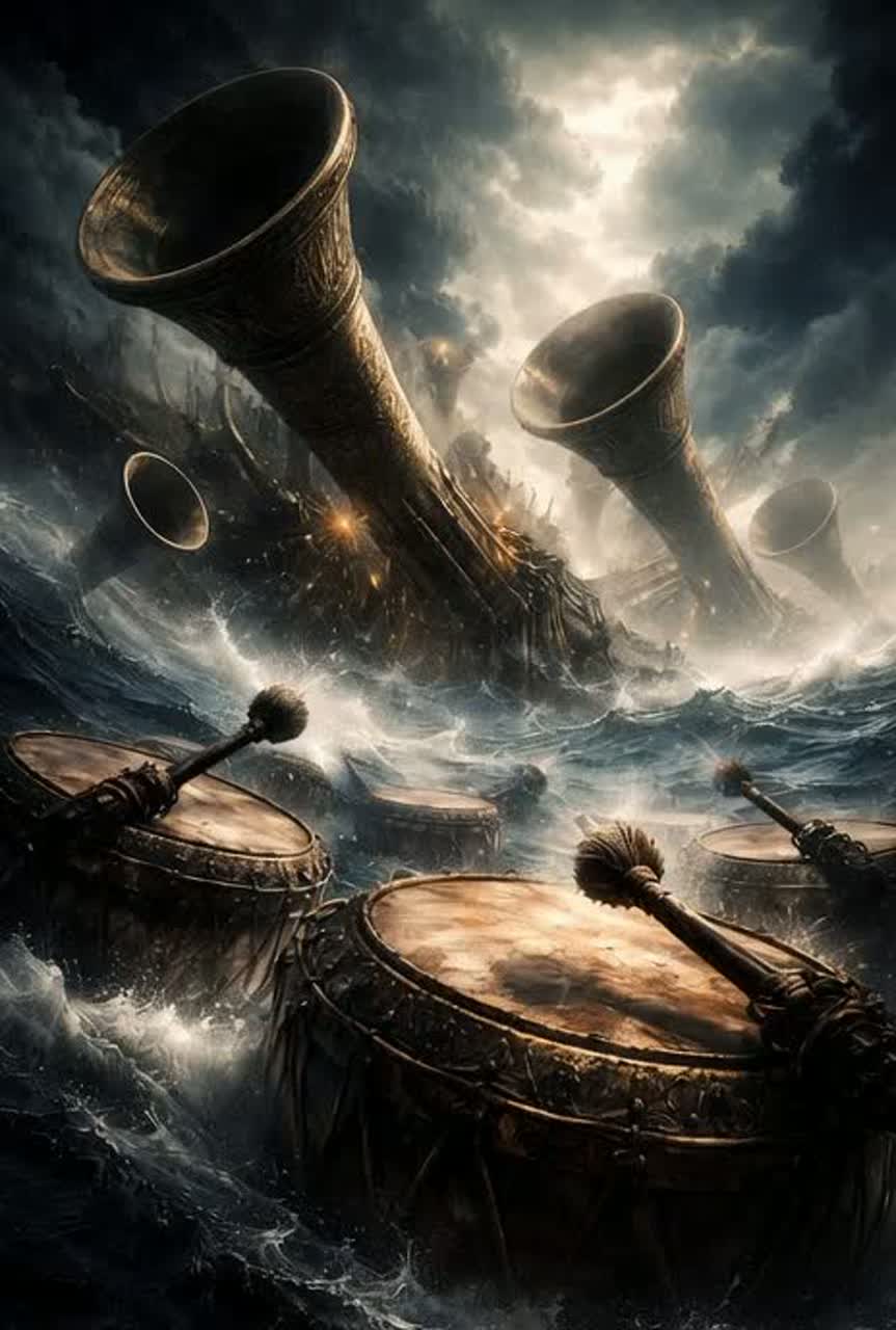 Powerful instrumental track driven by massive oceanic drums and deep tribal percussion, primal and cinematic, Thunderous toms and taiko-style drums feel like waves crashing against rocks, creating a relentless, hypnotic pulse, Low, heavy rhythm builds tension and raw passion, Layered ethnic instruments, frame drums, shakers, and subtle hand percussion add heat and movement, Dark cinematic bass underpins the groove, while distorted atmospheric synths and low brass stabs add intensity, Melodic motifs are minimal but bold, carried by plucked strings and haunting textures, Strong dynamic contrasts: explosive drum sections, brief breathing pauses, then powerful returns, Sensual, dangerous, and fiery energy without vocals, Modern cinematic production, wide stereo field, deep reverb like an open ocean at night, Feels wild, confident, emotional, and unstoppable, A soundtrack for forbidden desire and inner fire