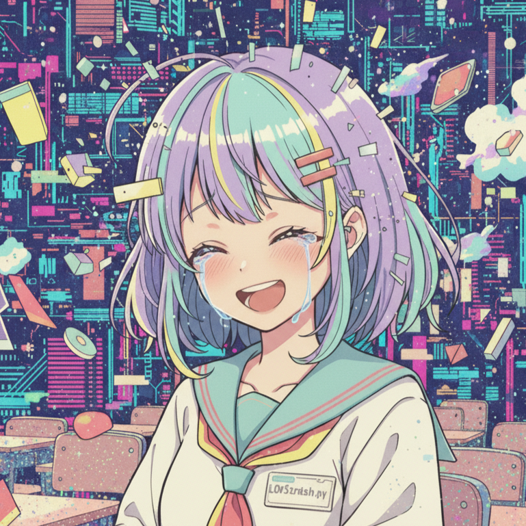 colorful, hyper-speed kawaii energy; laughing while crying in a sugar storm