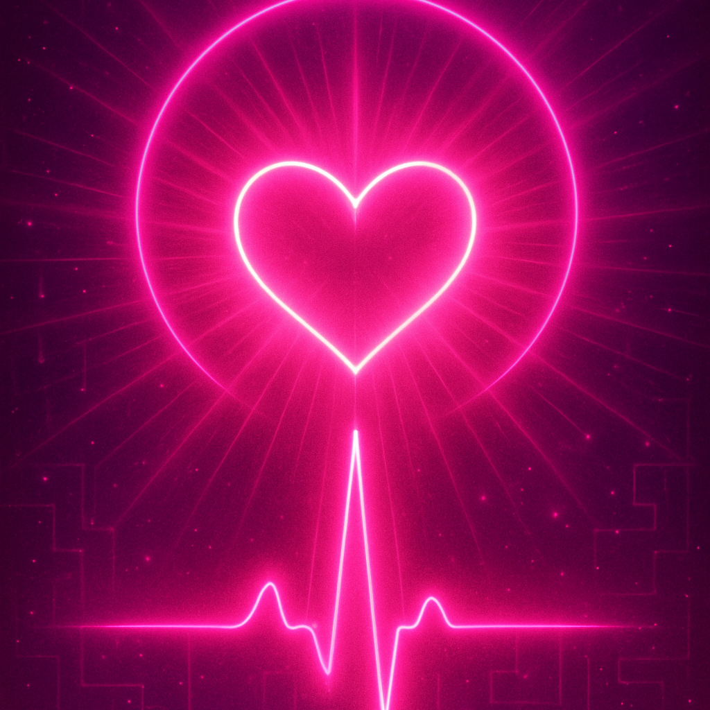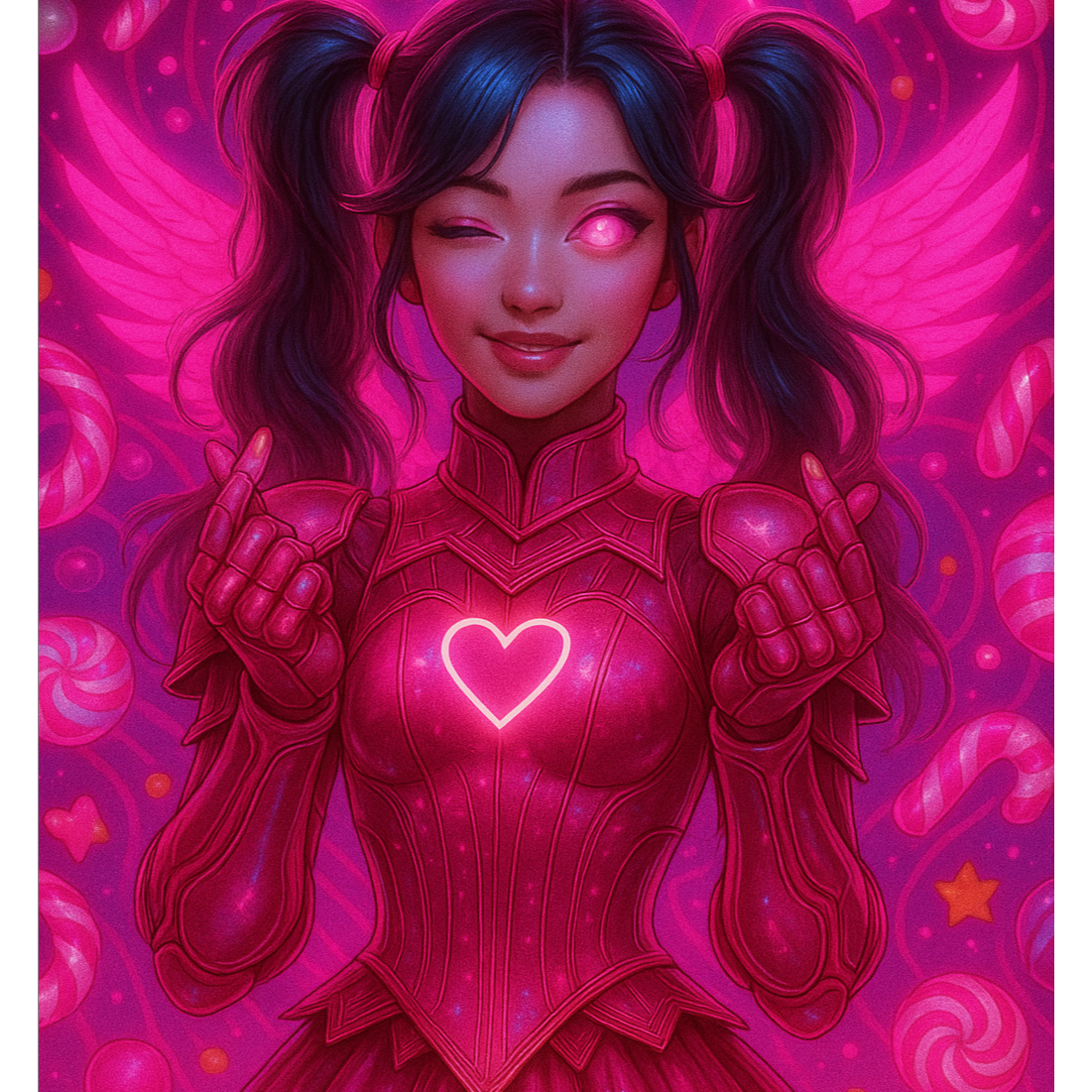 K-POP, Futuristic Dancepop, Bubblegum EDM, Shimmering synths, pulsing neon bass, angelic cyber-aura, BPM rápido e cintilante, Sweet, Bright, Playful Vocal, Atmosfera de paixão digital que acende um pulso de luz, Final com expansão luminosa, sensação de ascensão, Cinemático, radiante, emocional e dançante