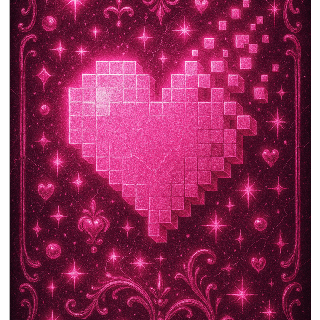 K-Pop, Retrofuture Pop, Eletrobaroque, Videogame EDM, Glitchy Synthpop, Bubblegum Hyperpop, Experimental Pop, Upbeat, Bright and Sweet Vocals, K-pop track mixing retro future pop, 8-bit synths, dance trance energy, and a hint of jazzy sweetness, Tempo around 124–128 BPM, key in F# minor or D major, Groovy electronic bassline, bubbly chiptune arps, bright synth stabs, and layered female vocals that blend cute and dangerous, Include call-and-response harmonies, vocoder glitches, and dynamic beat changes between sections, Bridge should feature a glitchy-trance break with filtered vocal samples, Overall vibe: playful yet intense, like a love story inside a videogame world — cute, addictive, and a little chaotic, Mood: pixelated romance, dreamy, electrifying, colorful