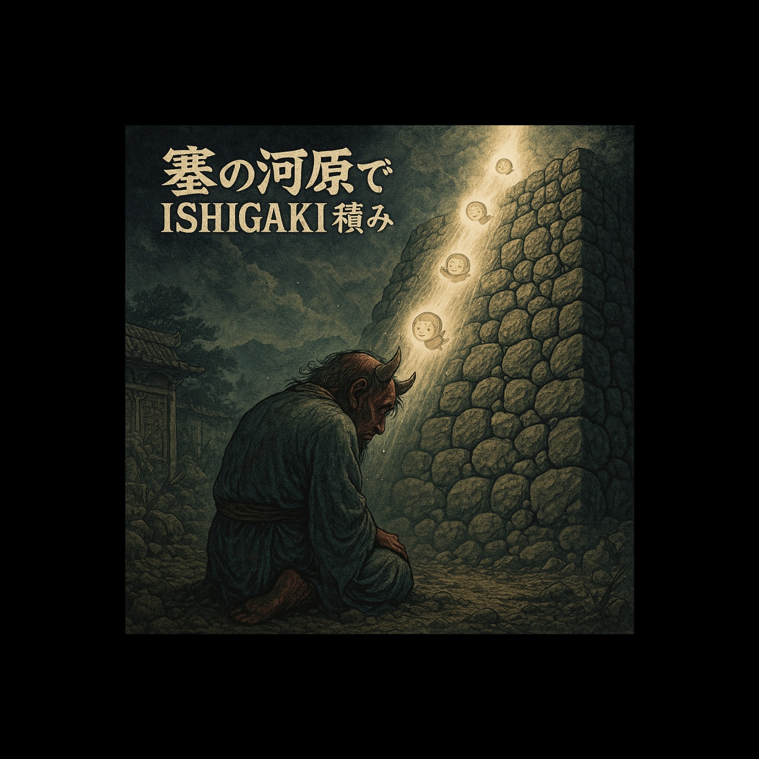 Death metal, Progressive metal, A high-speed progressive death metal and mathcore track with dramatic tempo changes and complex rhythms, The song starts with a dark, ominous Japanese traditional vibe, evoking the eerie atmosphere of Sainokawara (the Buddhist limbo for dead children), The early sections are chaotic but playful, with aggressive riffing and screamed vocals, It features heavy, jagged guitars and unexpected shifts, blending humor and intensity as children defiantly build a giant stone wall to block demons, In the bridge, the chaos breaks — the demon screams in frustration, The music transitions into a grand, sacred outro filled with heavenly light, using choir harmonies, ambient guitars, and a sense of spiritual transcendence, Ends with calm and solemn beauty