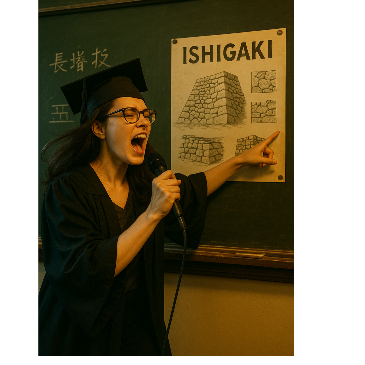 Opening with a calm spoken-word narration over soft Japanese ambient music — gentle koto, shakuhachi, and light taiko textures, creating a warm, educational radio-classroom vibe, The first half keeps the tempo slow and background unobtrusive, allowing the voice to clearly deliver historical explanations of ISHIGAKI, At the midpoint, a dramatic orchestral build swells into an epic ISHIGAKI METAL section: blending symphonic metal with Japanese folk melodies, featuring heavy distorted guitars, double-kick drumming, powerful bass, and soaring strings, Incorporate occasional traditional percussion accents (taiko, shime-daiko) alongside symphonic choirs for grandeur, Switch between clean, melodic vocals and occasional growls/screams for emphasis, End with a fade back into calm spoken-word over the ambient Japanese instruments, closing the “lesson” in a gentle and inviting tone, [Voice: kawaii girl voice]
