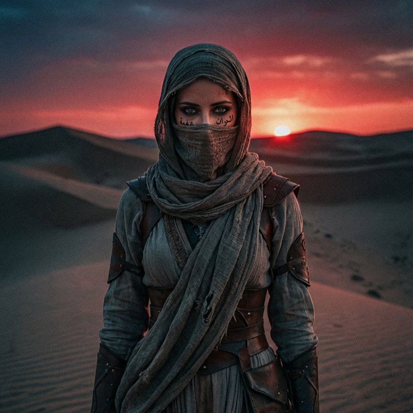 A dissonant orchestrated Middle Eastern blackened death metal piece, fusing brutal, sharp guitar riffs—both open and muted—with powerful, marked bass driving the rhythm, Interwoven are ancient Arabian folk chants, sitars and frame drums delivering classical oriental textures, The drummer executes complex, virtuosic transitions, shifting from jazz metal syncopation to djent polyrhythms to relentless black metal blasts, creating a savage, immersive soundscape, voice: theatrical middle eastern deep female vocals, but turn into death metal growls in the chorus, and a middle eastern arabian chants too