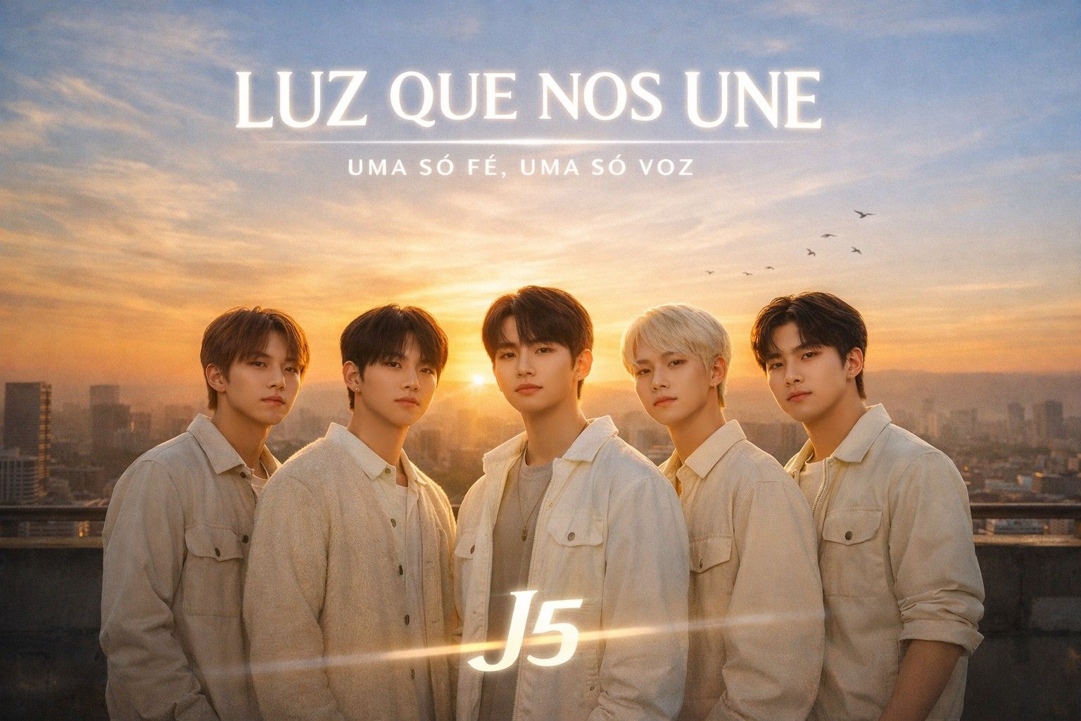 K-pop gospel boy group song performed by five male vocalists, Clear vocal role distribution: main vocal, lead vocal, sub vocals, melodic rap, Emotional verses, powerful group chorus, Tempo 100 BPM, modern K-pop worship style, Atmospheric synths, piano, deep pads, punchy drums, cinematic build-up, Inspired by BTS emotional tracks + contemporary gospel worship, Theme: faith, unity, light, redemption, hope, Language: Korean main version