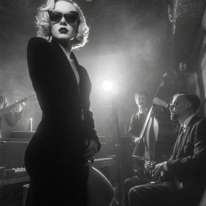 Live Concert, Dark Cabaret, Swing Jazz, Chanson, negative space, melancholic, Jazzy piano, jazz trumpets drone, wood bass, cartoonish wood winds, intense jazzy drums, subtle female low chilled voice, emotional, syncopated, high definition sounds, euphoric, satisfied soul voice with some tear squeezing moments, âMale Voice, âRock, âHigh Energy
