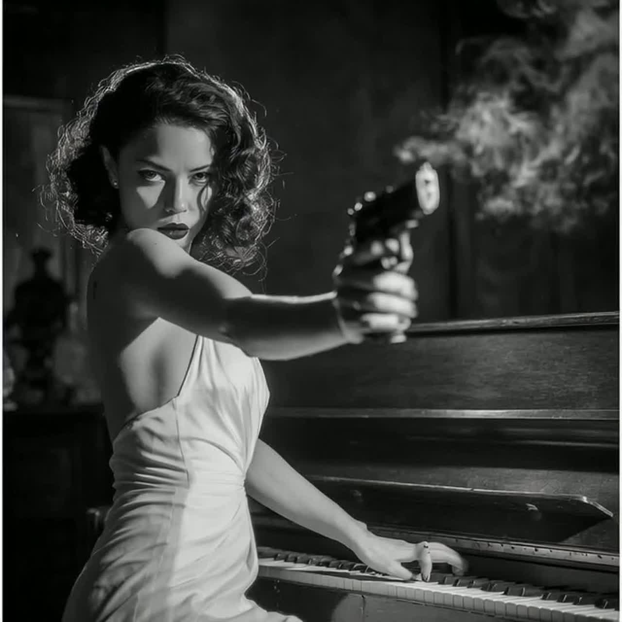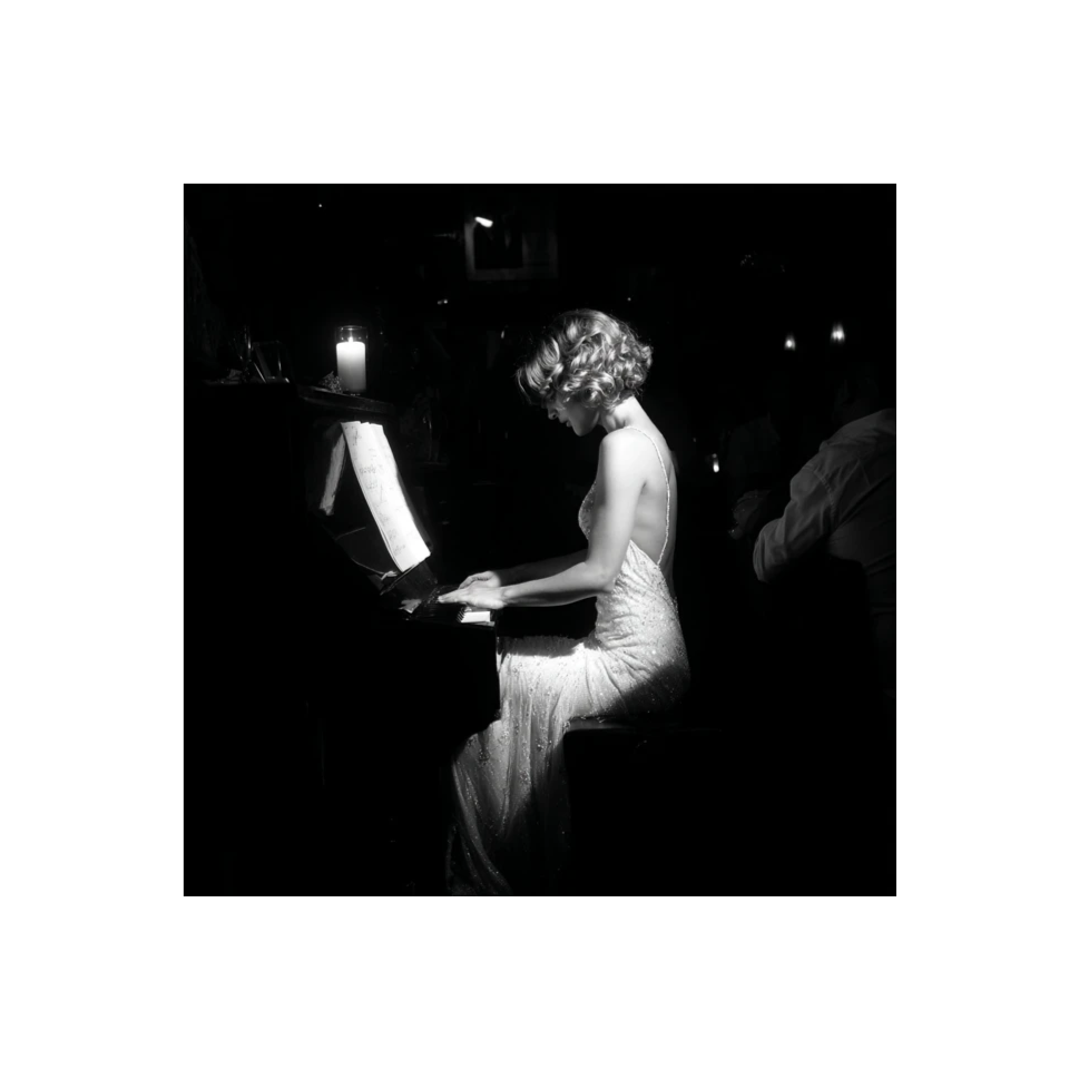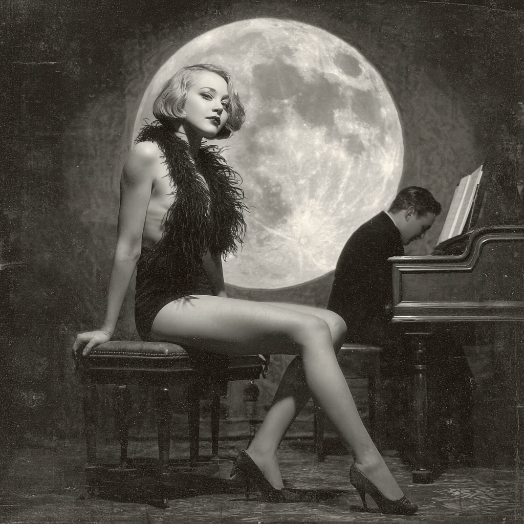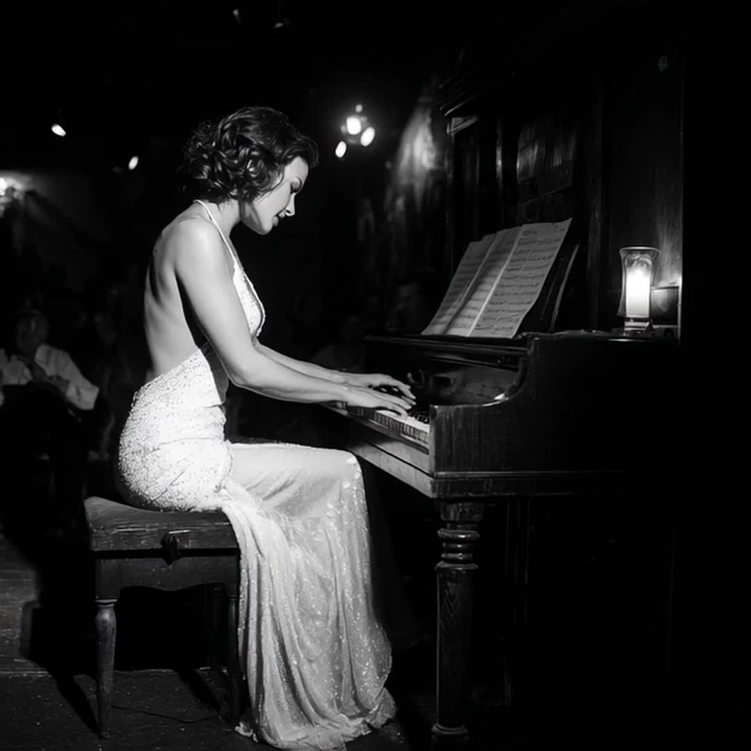 Live Concert, Focus on the Piano Theme, Dark Cabaret, Swing Jazz, Chanson, negative space, melancholic, Jazzy piano, jazz trumpets drone, wood bass, cartoonish wood winds, intense jazzy drums, subtle female low chilled voice, emotional, syncopated, high definition sounds