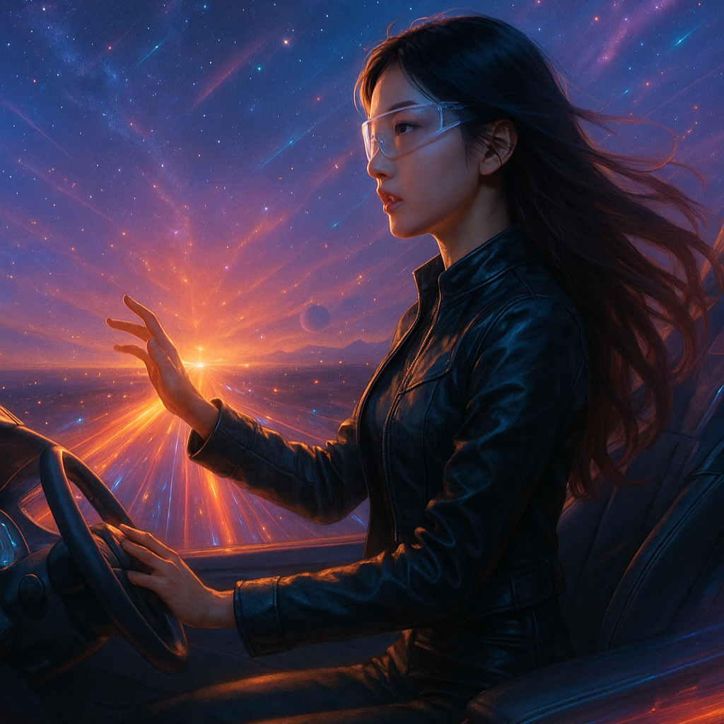 Female-vocal Orchestral EDM × Future Garage × Vocal Trance remix, 142 BPM in A minor, Starts with cosmic ambience — soft strings, sub-bass rumble, and distant radio chatter like a countdown to liftoff, Verse 1: ethereal vocals over delicate piano arpeggios and airy percussion, evoking pre-flight calm, Pre-Chorus: gradual orchestral build — cinematic drums, soaring pads, and heartbeat-like kick, Chorus: euphoric drop blending trance lead arps, symphonic brass, and side-chained strings; vocals expand to full-range belting “I’m in the frontseat, lights collide!” Bridge: weightless ambient break with vocal echo drifting through stars, subtle granular texture and reversed piano motifs, Final Chorus: massive orchestral-electronic climax — choir harmonies, layered leads, sub-bass lift, and reverb tail that fades into a horizon of light, Vocal tone: luminous, emotional, heroic; verses soft and introspective, choruses powerful and soaring, Mood: from earth to cosmos freedom elevated