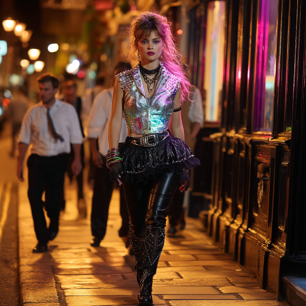 1980's tough girl power rock anthem with attitude, Driving new wave drums and pulsing bass lay the foundation, layered with lush 80s synths and rhythmic piano, Harpsichord arpeggios interlock with the piano, adding a baroque pop touch, The tough mezzo-soprano leads, supported throughout by tight, expressive three-part polyphonic harmonies, Shepard tones ascend throughout