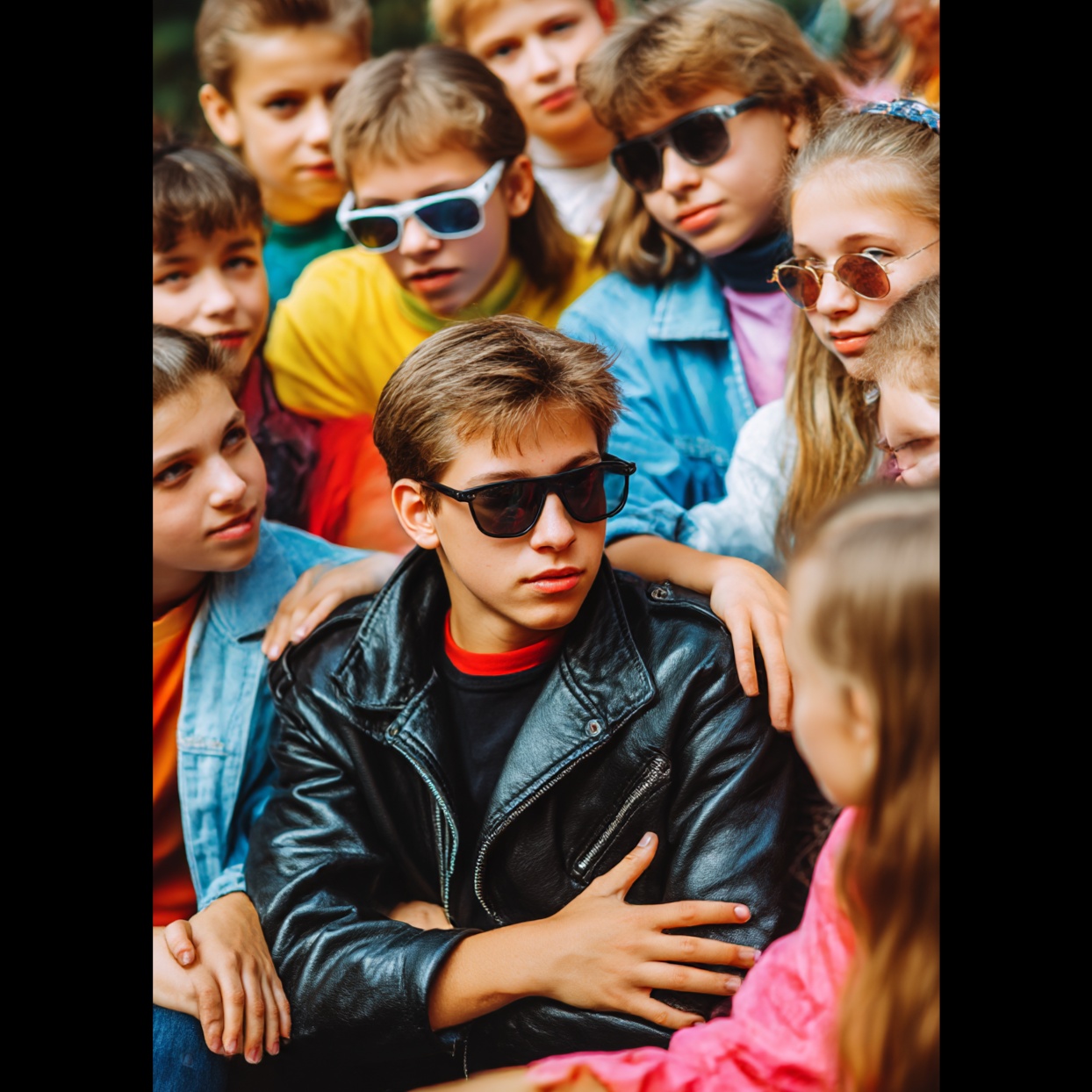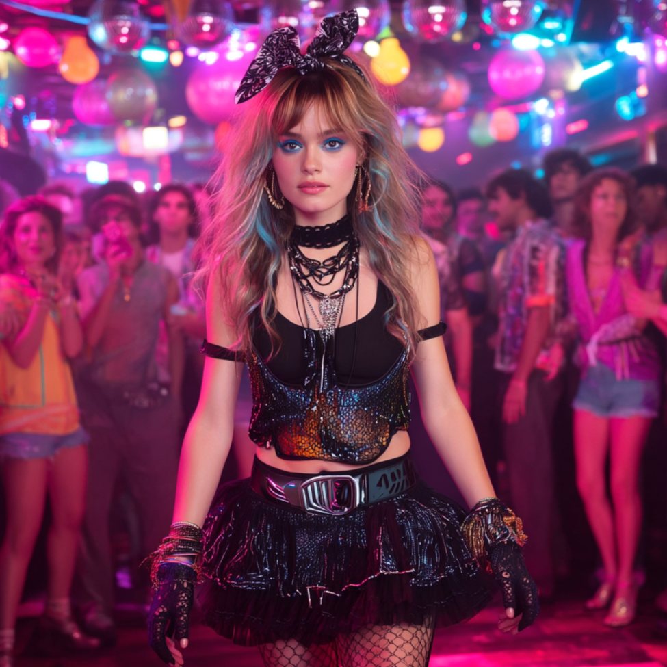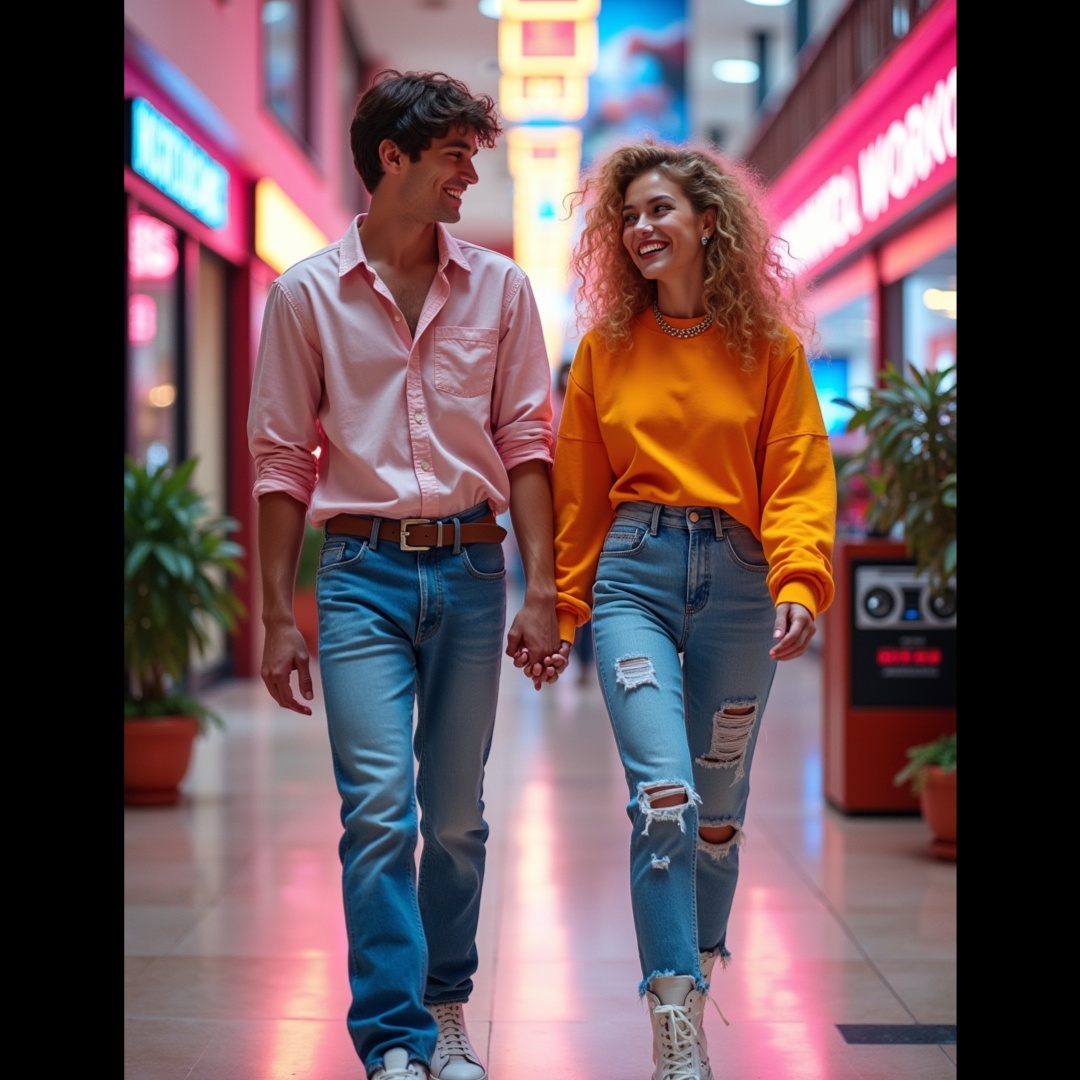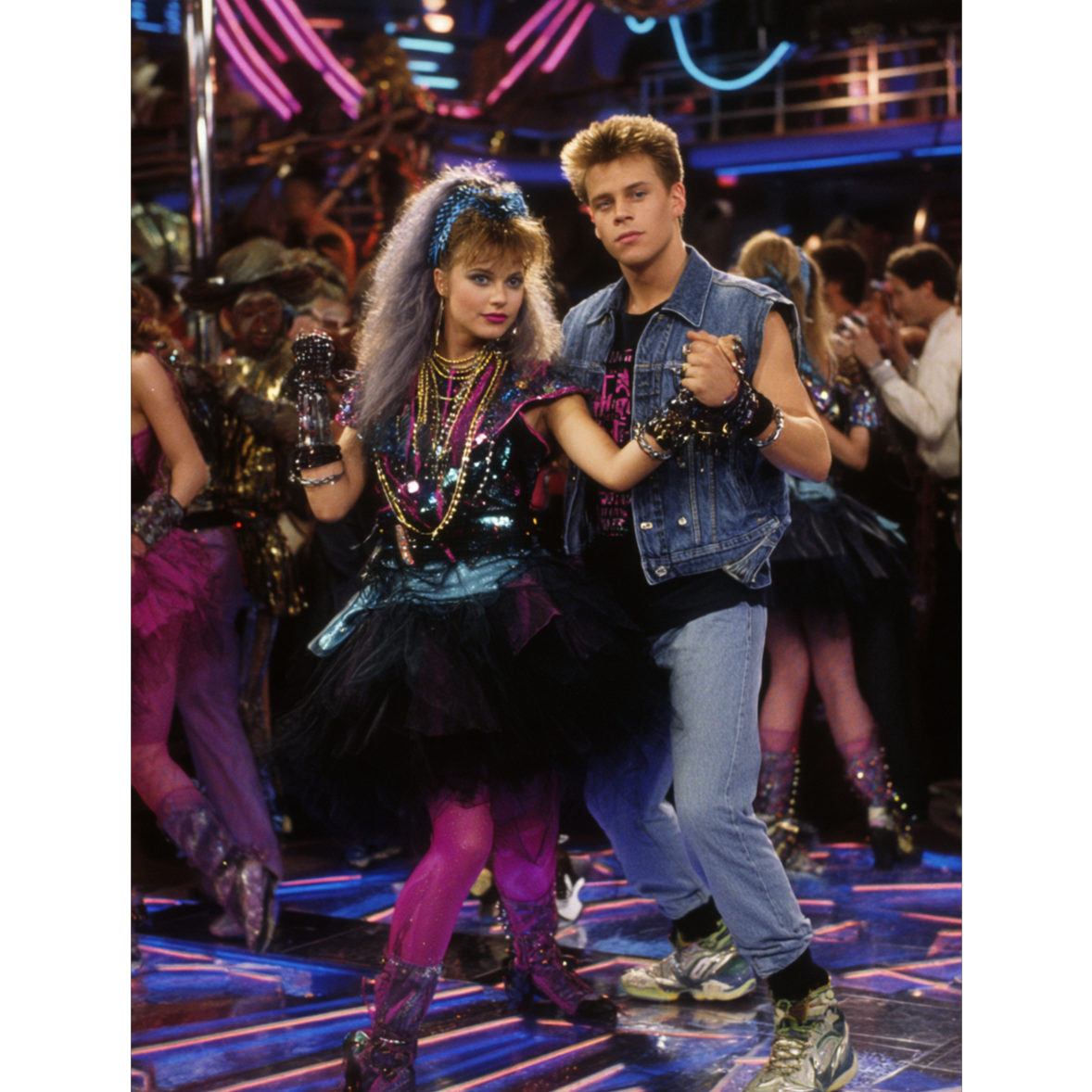 1988 upbeat synthwave teen pop song with a rebellious edge, Kick off with dark vintage synth arpeggios, then layer catchy bass and bright polysynths for a playful but edgy verse groove, Pre-chorus adds syncopated claps and high synth stabs, Big, catchy hook-driven chorus bursts with layered keys, electronic percussion, and energy, Breakdown strips to funky bass and sampled vocal chops, rebuilding to a synth-rich, danceable outro fade, Features a duet and energetic three part polyphonic harmony, Imagine teen pop stars performing in the middle of a 1987 shopping mall