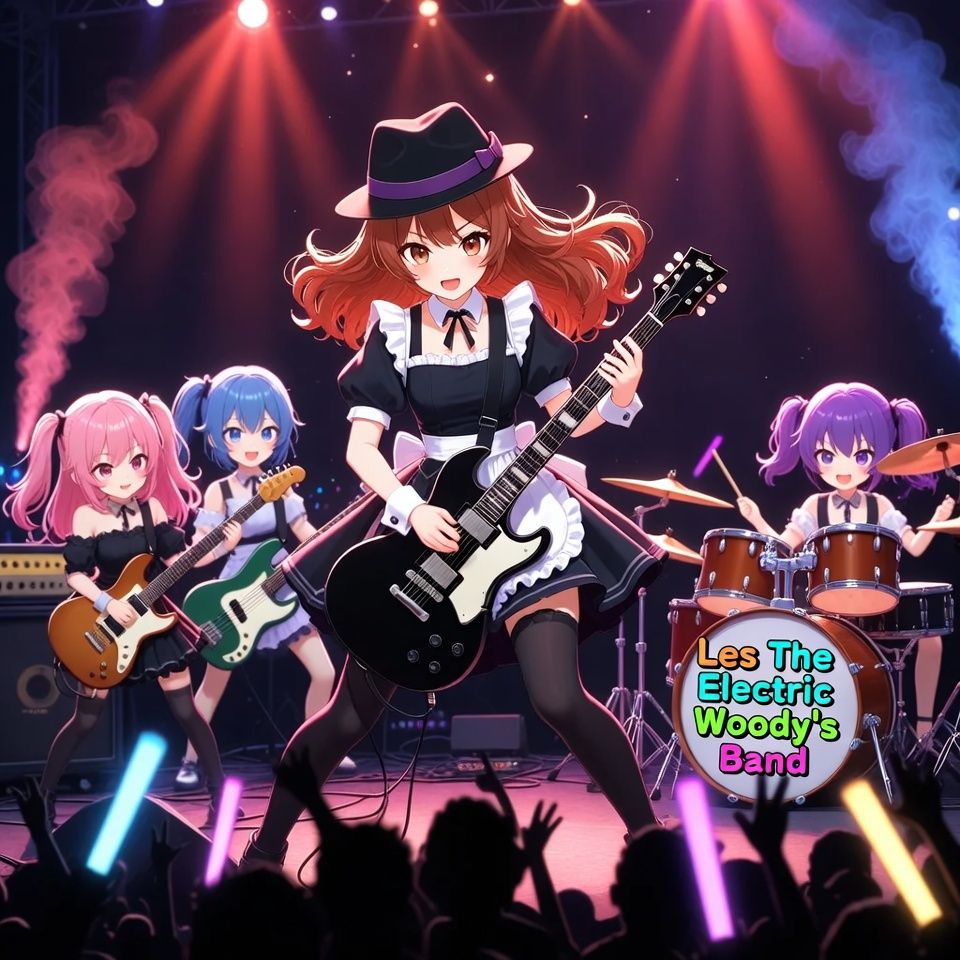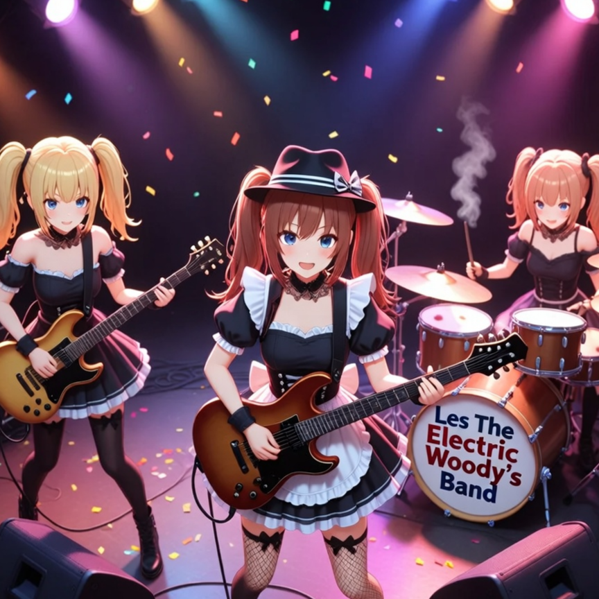 Energetic Japanese female rock band, Kawaii idol-metal vibe, powerful electric-guitar riffs with bright distorted tones, driving rock drums with double-time hi-hats, melodic bassline, catchy J-pop-inspired vocal hooks, cheerful yet hard-hitting, lively stage feel, clean but slightly raspy female lead vocals in Japanese rock style, occasional cute idol chants and call-and-response, touch of folk-rock acoustic texture in the verses