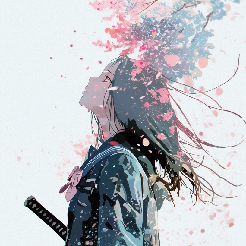 [Neo-Japanese Future Rock × Ethereal Breakbeats × Ambient Swordwave], [Female lead vocal (crystalline yet breathy; mid-high range with wavering sustain; sudden falsetto slippage)], [BPM: 142, with triplet swing interludes and 4+3 beat segmentation], [Key: A# minor → modulated bridge in B Dorian], [Guitar tone: Clean delay+chorus layers alternating with glitched distortion cuts], [Rhythmic foundation: soft taiko-sample infused breakbeats, asymmetrical kick-snare hits, glitch percussion triggers layered with organic breath pulses], [Atmosphere: nostalgic violence, floral sadness, lone resolve under spring sky, Sakura as ephemeral soul fractals], [Sound design uses reverse flute pads, field recordings of wind and blossoms, koto-transformed synths, soft vocal chops drifting like falling petals]