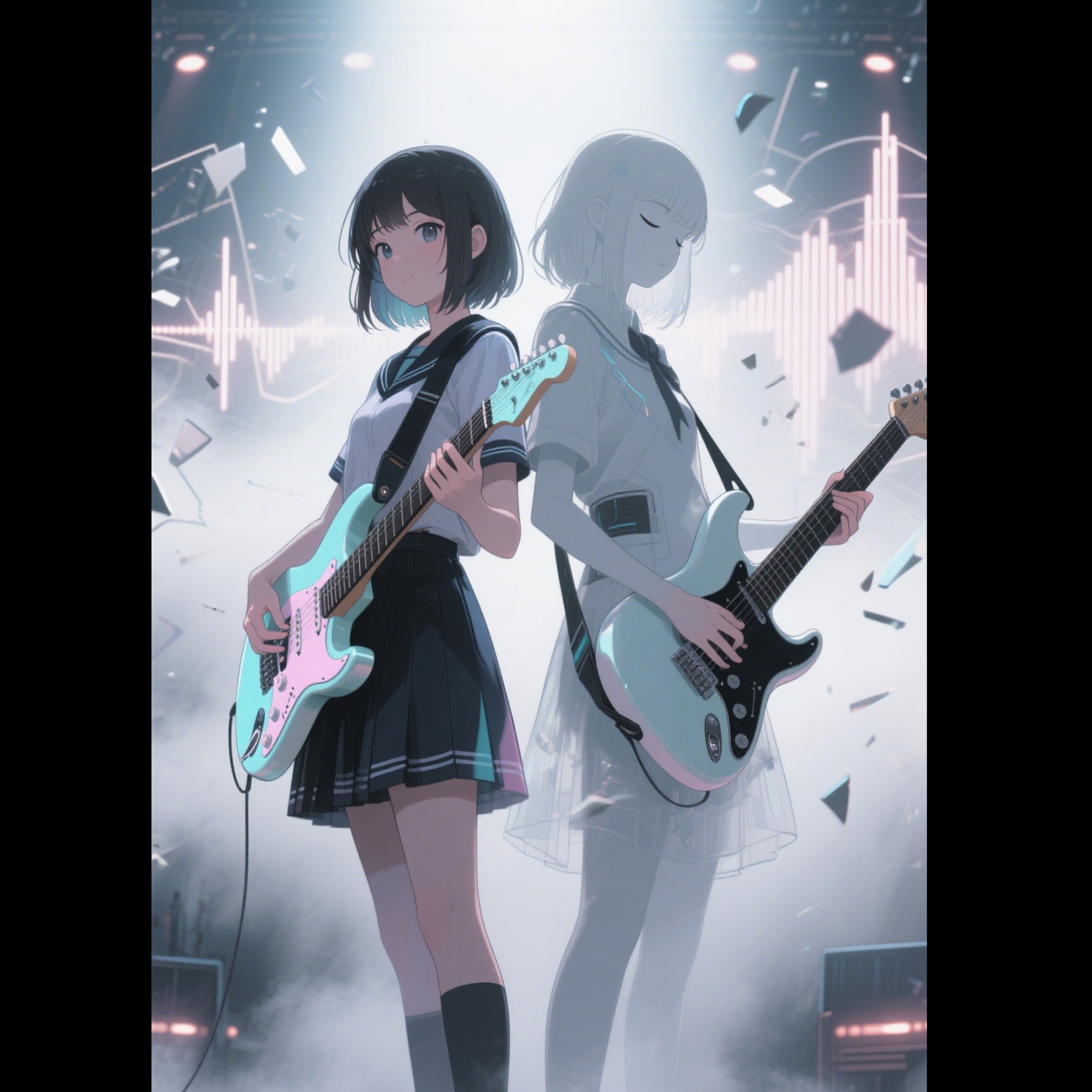[Neo-Fusion Opera × Jersey Club Drop × Cinematic Trap Ballad × Future Pop AI Soundscape], [BPM: 68 (intro slow ballad) → 122 (Trap rap) → 146 (Jersey Drop) → tempo broken segment], [Key: G# minor → modulate C Mixolydian during climax → resolves in E Major final chorus], [Vocalist: Female lead with five-octave range, hybrid of operatic bel canto and Vitas/Diva-Dance agility, layered with ghost synth harmonies], [Vocal tone: Ethereal × sharp × at times mechanical], [Arrangement: haunting ambient pads + glitched vocal loops + delayed silence pulses + sudden beatbreaks + synthetic breathing FX + vocoder fractures + sub-bass glitch build-ups + reversed synth arpeggios + whistle modwheel FX], [Production: Wide stereo panning, fractured sound design, granular glitch-vocal rhythms, master reverb trails for infinite echoing feel], [Concept: Conflict between AI and human musicians; eventual emotional synthesis through collaborative creation; tension, critique, poetry, and transcendence]