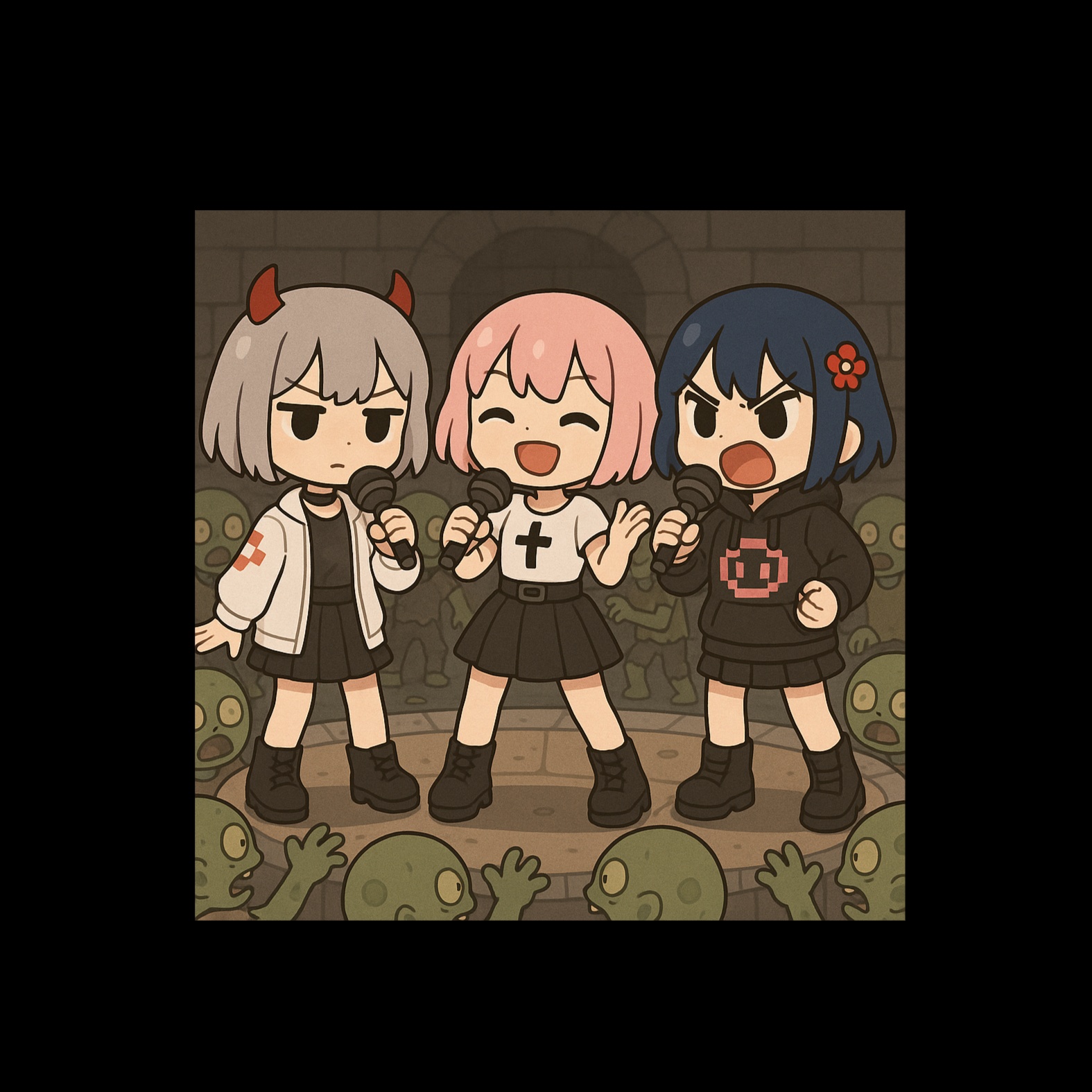 [Cinematic Post-Hardwave × Emotional Techno Choircore × Sacred Resistance Anthem], [Three differentiated female vocals + fragmentary chant overlays], [BPM: 132 (drone pulse intro) → 80 (glitch freeze) → 146 (militant echo) → 158 (triplet collapse surge)], [Key: E minor (descent theme) ↔ G# minor (ascent theme counterpoint)], [Production prioritizes: burst-mix saturation, chant-burst contrast, glitch pulse interruption, stereo riot image bleeding], [Tonal Concept: a sacred emotional virus reviving the soul of a zombified city via distorted divine screams, ]