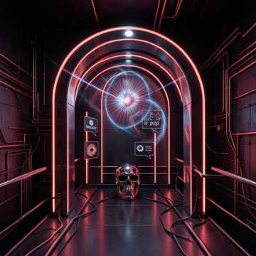 Aggressive Glitch-Pop, hyper-processed vocal chops, heavy, distorted 5-string synth-bass, fast, frantic drum machine patterns, constant high-frequency digital chirps